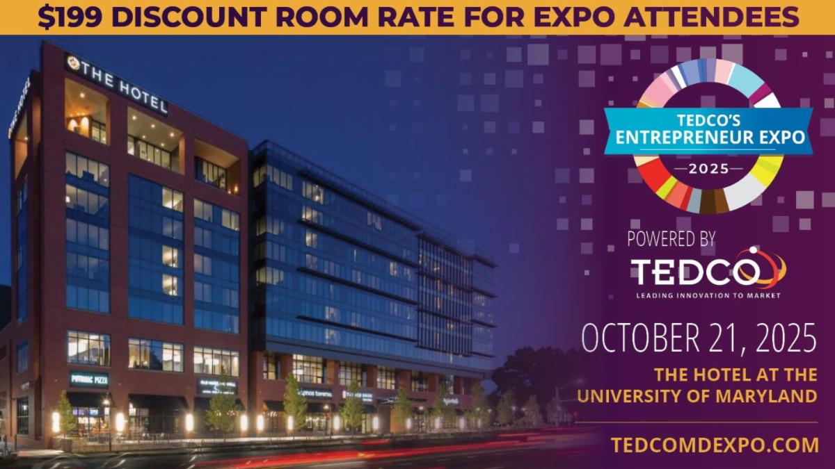 Planning to stay overnight?! TEDCO has secured an exclusive $199 discounted hotel rate for Expo attendees, giving you convenience, comfort, and more time to connect with Maryland’s innovation community.