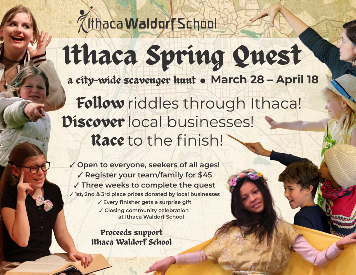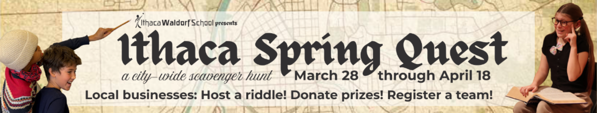 Ithaca Spring Quest is a community-wide scavenger hunt sending families and friends on a riddle-solving adventure through Ithaca's streets, neighborhoods, and local businesses. Teams register for $45 and follow a series of clues to discover some of Ithaca's favorite spots along the way. Complete the quest and earn a surprise gift; finish in the top three and win a prize generously donated by local business partners. Ithaca Waldorf School would love to see the whole community out there exploring Ithaca together this spring!