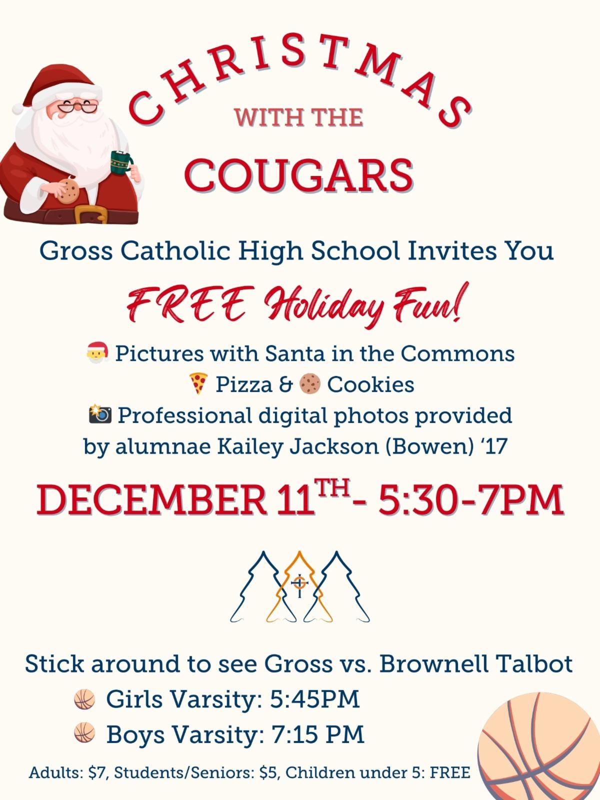 | | Christmas with the Cougars | | The Advancement Department was pleased to host our generous donors and members of the Dux Esto Society. The reception was held in the Commons, where guests enjoyed light hors d’oeuvres and beverages, an address from President Steve Eubanks, a Robotics demonstration led by students and Mr. Steve Hammersky, and a performance by the choir and Latino band led by Mr. Romero. It was a lovely evening and a meaningful opportunity to express our deep appreciation to those who care so deeply about Gross Catholic. | |