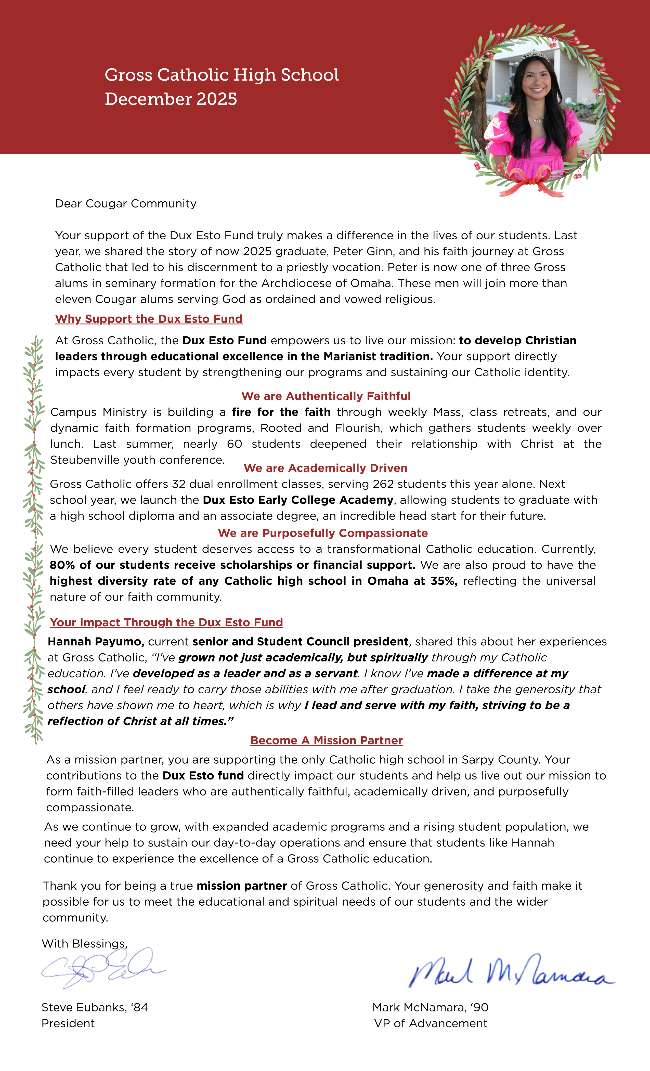 Do you own a business? Do you work at a business? Are you looking to grow your customer base? Last year, we started the Alumni Business Directory as a way to support our fellow Cougars with the services and products we need every day. Our alumni built the strong foundation of Gross Catholic and this is an opportunity to expand that foundation throughout the community.