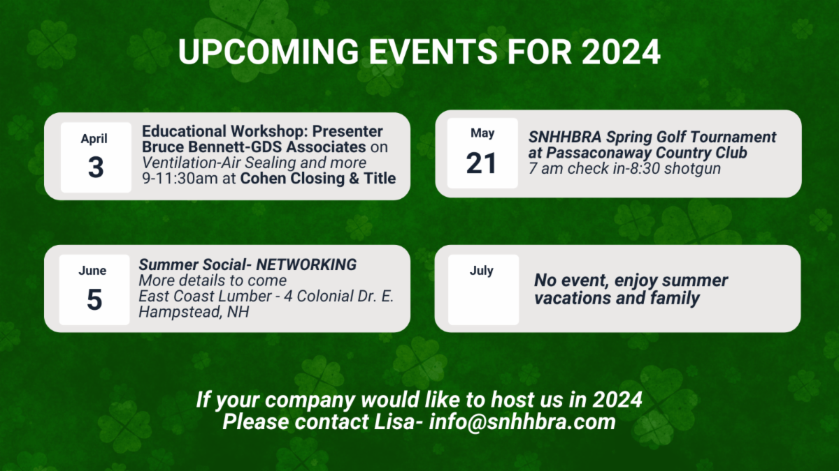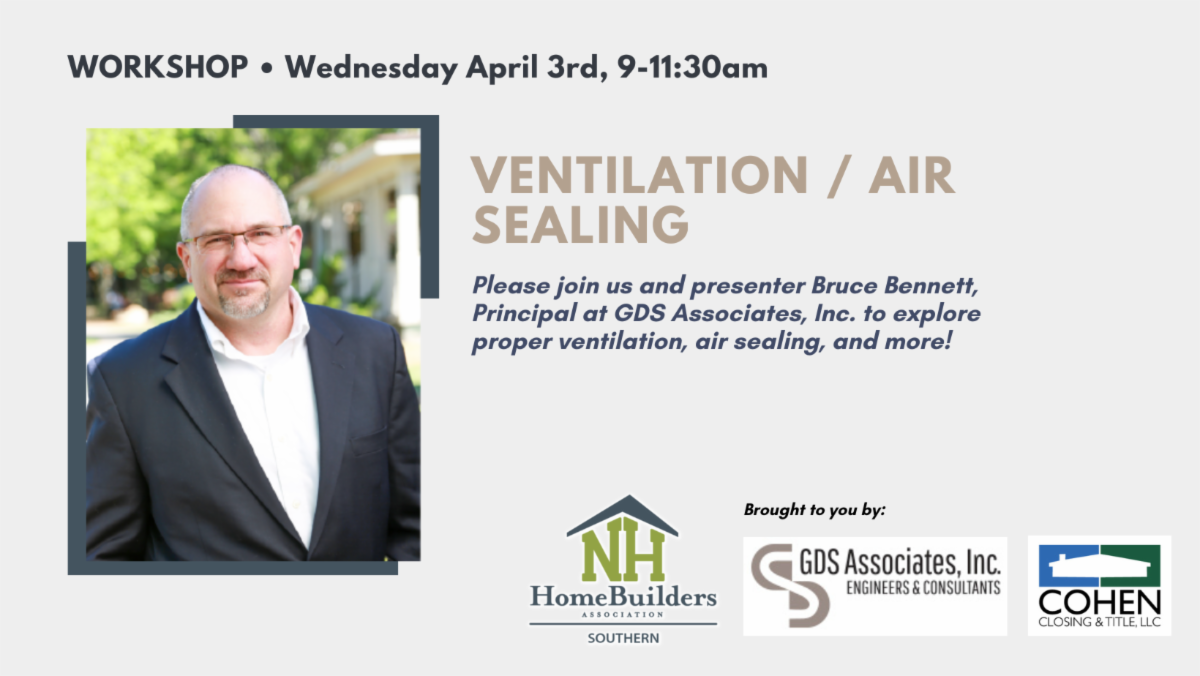 On April 3rd, we will be hosting a workshop for our Builder Members with Bruce Bennett-GDS Associates. He will be discussing Ventilation-Air Sealing-Energy Code. Thank you to our great partners at Cohen Title and Closing for use of their wonderful Community Meeting Room at their Bedford facility. This allows not only a close proximity for everyone plus it helps us to keep the costs of such an important meeting down. Thanks, Cohen Title!