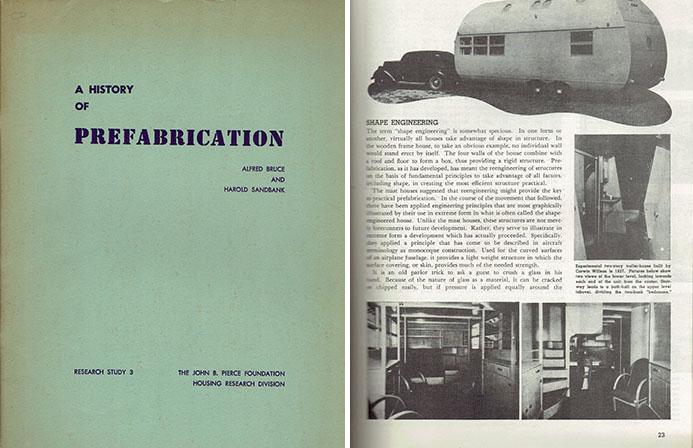 [Architecture]. Bruce, Alfred and Harold Sandbank. A History of Prefabrication. New York: John B. Pierce Foundation, 1945. Third Printing. Quarto, pp. 80, illustrated with b/w photographs. Cloth over Boards. Very Good; 1" open tear on back cover.
