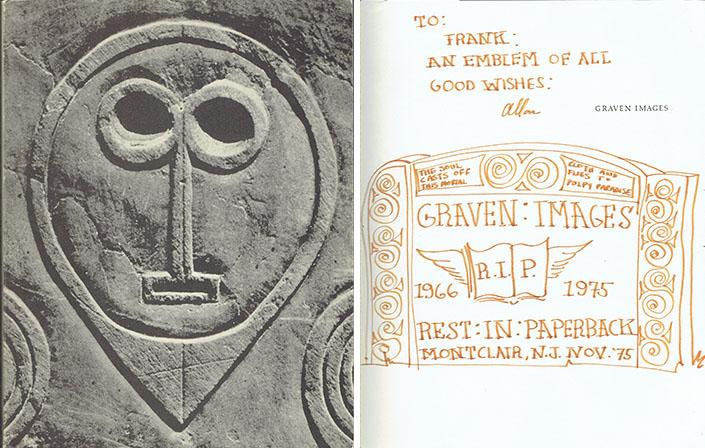 [Stone]. Ludwig, Allan I. Graven Images: New England Stonecarving and its Symbols, 1650-1815 - signed by the author. Middletown, CT: Wesleyan University Press, 1975. First paperback edition. Small quarto, pp. 482, indexed, illustrated with b/w photographs. The title page is embellished with a full page tombstone illustration and signature by the author, who celebrated this first paperback edition with an inscription on his tombstone illustration reading "the soul casts off this mortal cloth and flies to pulpy paradise." Oversized Paperback. Very Good.