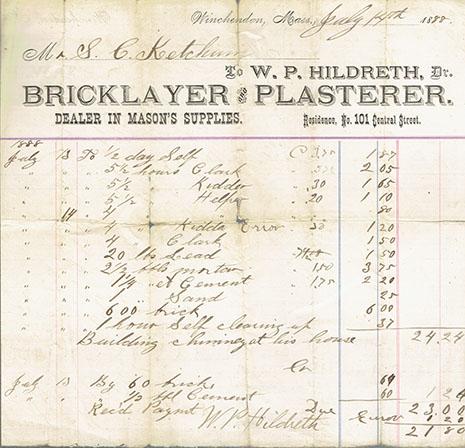 This bill was written up over July 13 and 14, 1888, tallying the labor and materials costs for building a chimney for Winchendon (Mass.) resident Stephen Cummings Ketchum. W. P. Hildreth Masonry was still active in the mid-to-late 20th century, but appears to be defunct now. An interesting piece of Winchendon business history. (23549) $75.00