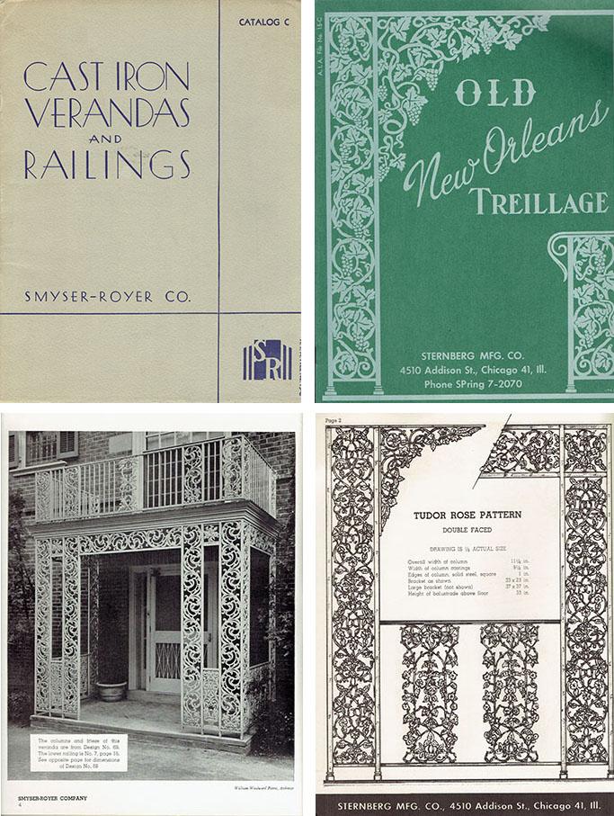 [Metal]. Smyser-Royer Company. Cast Iron Verandas and Railings, Catalog C A.I.A. File No. 15-C. Philadelphia, PA: Smyser-Royer Company, 1940. First edition. Quarto, pp. 32, illustrated w/ b/w photographs and architectural drawings. A second catalog titled "Old New Orleans Treillage" by the Sternberg Manufacturing Company in Chicago, is included in this lot. Staplebound Wraps. Very Good.
