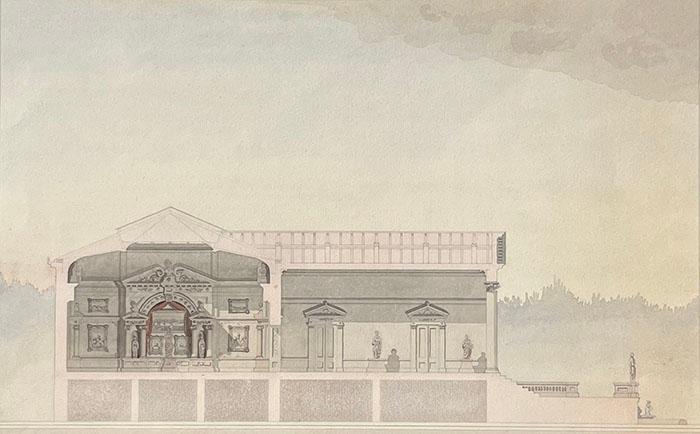 An intricately detailed side elevation of an art museum, showing a hallway of statuary, statues on the staircase, and an inner gallery of paintings and statues with beautiful classical pediment, arch and columns. (23573) $60.00