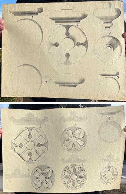 [Design]. Anonymous. Two Drawings of Architectural Ornamentation. nd c. 1900. Original drawing. Two sheets, each 13" x 17", showing architectural ornaments displayed directly and in profile, drawn in ink and shaded with diluted ink or watercolor paint. Original pen and ink drawings. Very Good.
