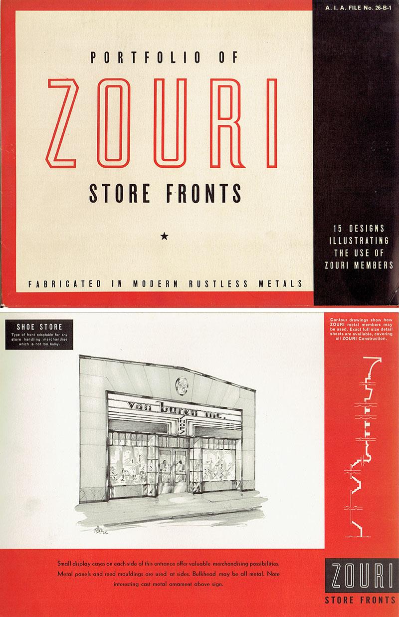 [Metal]. Zouri Store Fronts. Portfolio of Zouri Store Fronts Fabricated in Modern Rustless Metals 15 Designs Illustrating the Use of Zouri Members; A.I.A. File No. 26-B-1. Niles, MI: Zouri Drawn Metals Co., nd c. 1936. Original edition. Folding portfolio, with 15 loose sheets, each displaying a b/w architectural drawing of a store front. A bonus storefront image laid in, showing a proposed storefront designed by Reinle-Salmon of Baltimore. Folding portfolio with loose plates in pocket, as issued. Very Good.