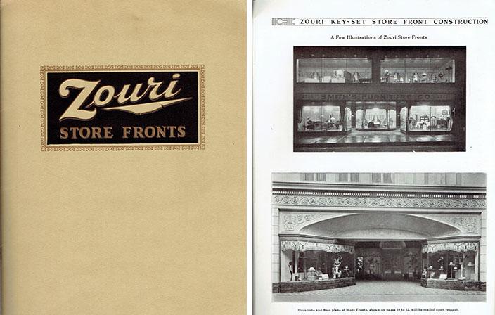 A very rare set of metal and glass storefront designs by the Zouri Drawn Metals Co., known for inventing a safer way to install storefront glass. Many older and historic buildings still have Zouri storefronts in use today. The catalog illustrates 16 different store fronts, showing everything from the very simple to the ornate. An intriguing glimpse of store front architecture from a century ago. (23547) $175.00