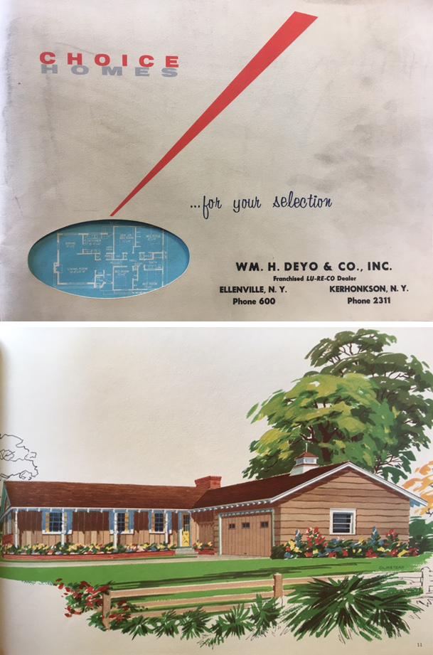 [Pattern Book]. National Plan Service, Inc. Choice Homes ...for your selection. Chicago. IL: National Plan Service, Inc., 1960 (circa). Oblong quarto brochure, pp 48, illustrated with color drawings and b/w floor plans. Front cover branding by dealer William H. Deyo & Co., Inc., in Ellenville, NY and Kerhonkson, NY. Staplebound w/illustrated stock covers.. Very Good; soiled cover.