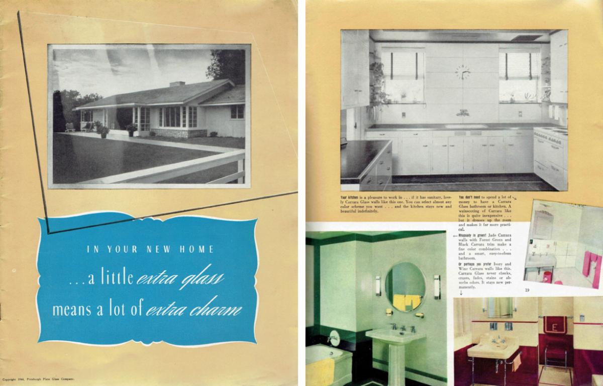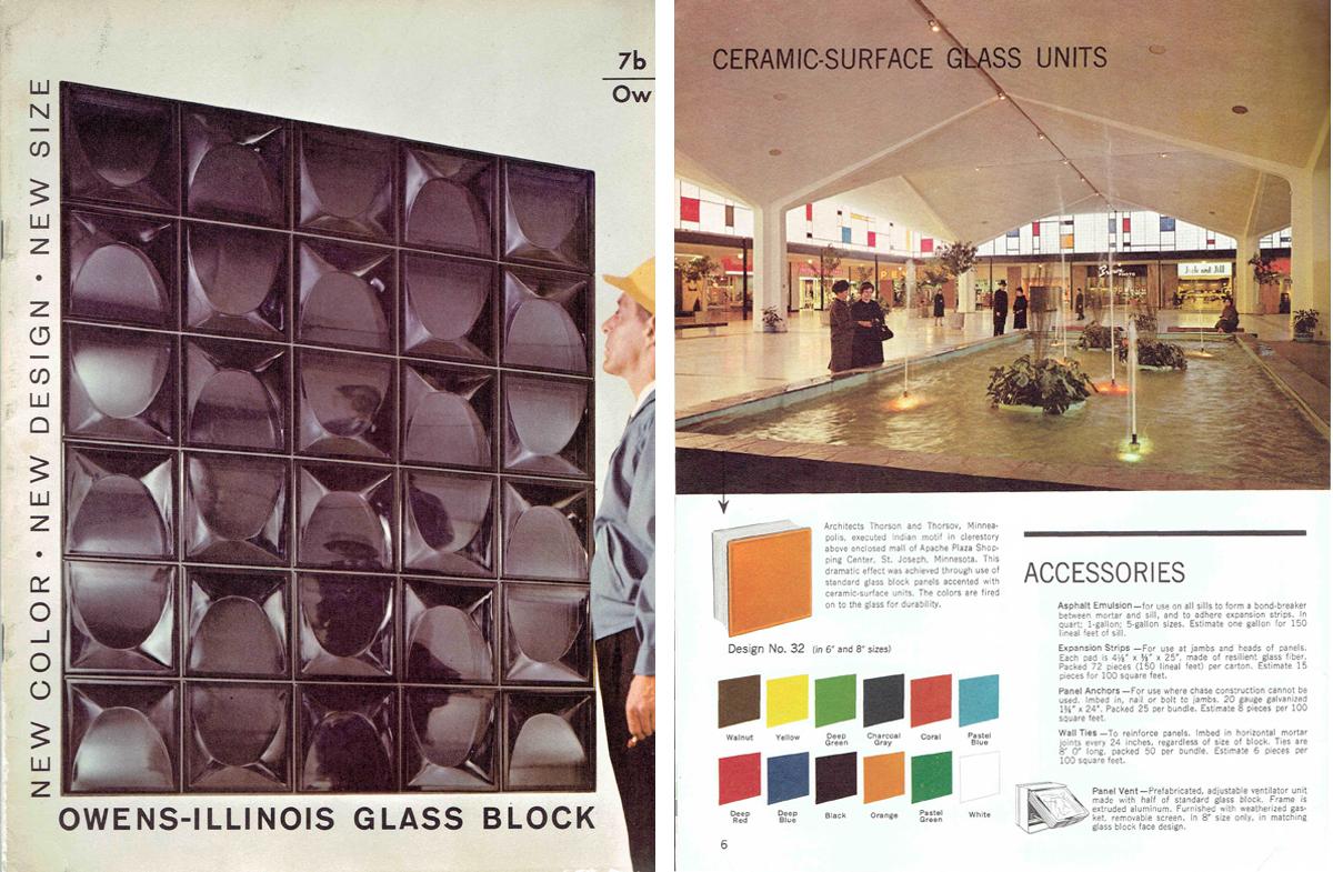 Scarce trade catalog showcasing a new color, "Royal Gray," developed expressly to fill the architect's need for a neutral color in molded glass. The other colors available were clear, shade green, and shade aqua. The Crescent unit (see front cover scan) provided a new texture never before available in a glass masonry unit, and also featured the Royal Gray color. The catalog also features a ceramic-surface glass with the vivid colors that were so popular in the 1960s, such as bright yellow, orange, deep green, pastel blue, and deep red. Includes specifications for installation and data on light performance. (20444) $55.00