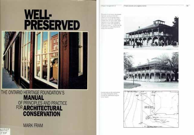 [Conservation]. Fram, Mark. Well-Preserved The Ontario Heritage Foundation's Manual of Principles and Practice for Architectural Conservation. Ontario, Canada: Boston Mills Press, 1988. First edition. Quarto, pp. xi, 239. Indexed, illustrated with numerous b/w photographs and architectural drawings. Spiral