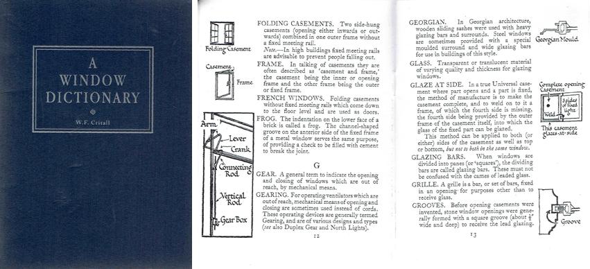 [Windows]. Crittall, W. F. A Window Dictionary Containing Illustrated Descriptions of Technical Terms used in connection with window openings. London: B.T. Batsford Ltd., 1926. Reissue. 24mo (4" x 5.5"), pp. 43, illustrated with b/w drawings. Staplebound Wraps. New.