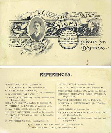 A very nice illustrated and hand-lettered trade card for L. C. Gleason & Co. Signs, a sign painting and lettering company in Boston in the early 20th century. The card advertises "Signs and such work of every description, estimates and designs furnished, house, store and office painting", with "particular attention given to signs on brass, copper & princess metal". The reverse side lists references from 22 Boston area businesses, including the Singer Mfg. Co., Coats Thread Co., the Hotel Tivoli, and Rochester Brew Co. An interesting piece of Boston commercial history. (15943) $45.00