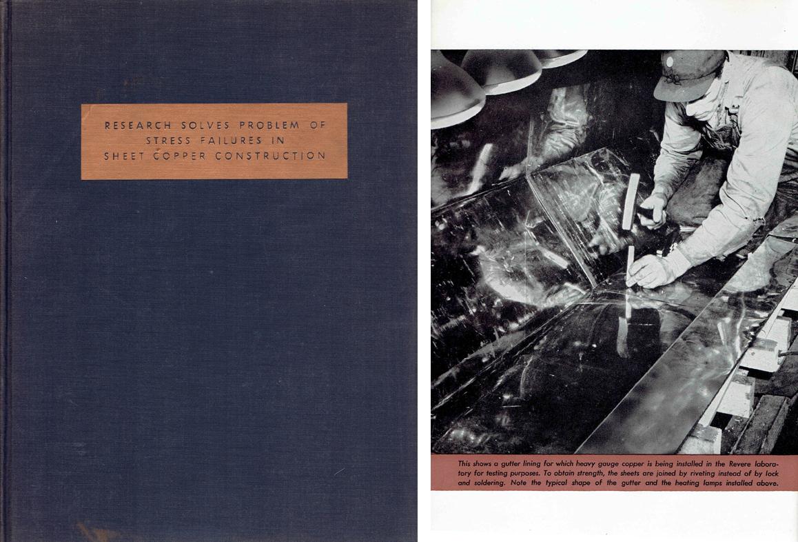 [Metal]. Anderson, I. E. and Walter C. Voss. Research Solves Problem of Stress Failures in Sheet Copper Construction. New York: Revere Copper and Brass Inc., 1945. First edition. Octavo, pp. 96, illustrated with b/w photographs and construction details for seams, parapets, valleys, gutters, expansion joints, cornices, etc. Original Cloth. Very Good.