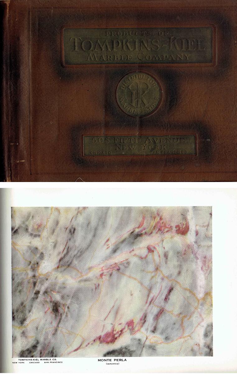[Stone]. Tompkins-Kiel Marble Company. Products of Tompkins-Kiel Marble Company. New York: Tompkins-Kiel Marble Company, 1911. Original edition. Oblong quarto, pp. 56. Full color 6" x 8" marble tile sample on each page. Leatherette, bound w/cloth ties. Very Good; 1.5" scrape on back cover.