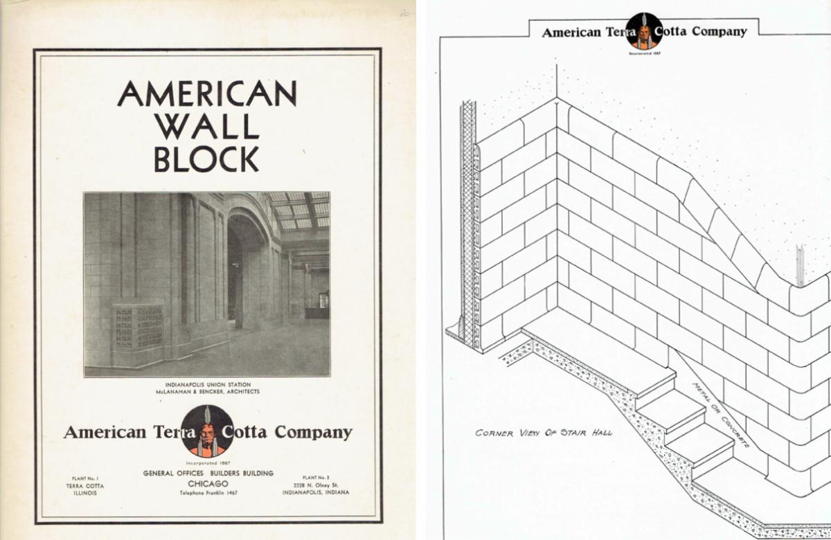 [Terra Cotta]. American Terra Cotta Company. American Wall Block. Chicago, IL: American Terra Cotta Company, nd c. 1920. Quarto, pp. 10, illustrated with b/w architectural specification drawings. Staplebound Wraps. Very Good.