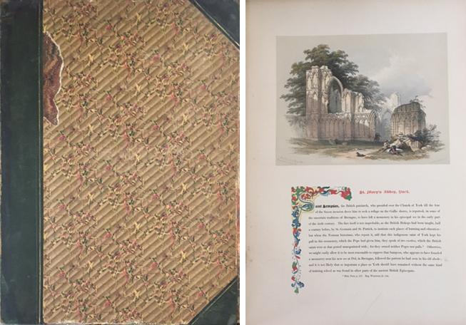[International]. Churton, Edward. The Monastic Ruins of Yorkshire (2 volumes, complete). York: Robert Sunter, 1843. First edition. Elephant folio (18" x 24"), pp. ix, 88, plus two hand-colored title pages, a hand-colored dedication leaf, 34 hand-colored full-page plates, 24 hand-colored half-page plates, 22 uncolored full-page plates (some tinted), and a map. The page count is deceiving; each volume is over 2" thick. Half leather with marbled boards and marbled endpapers. Good; text block detached from covers, scattered foxing to some text and plates, heavy wear to cover.