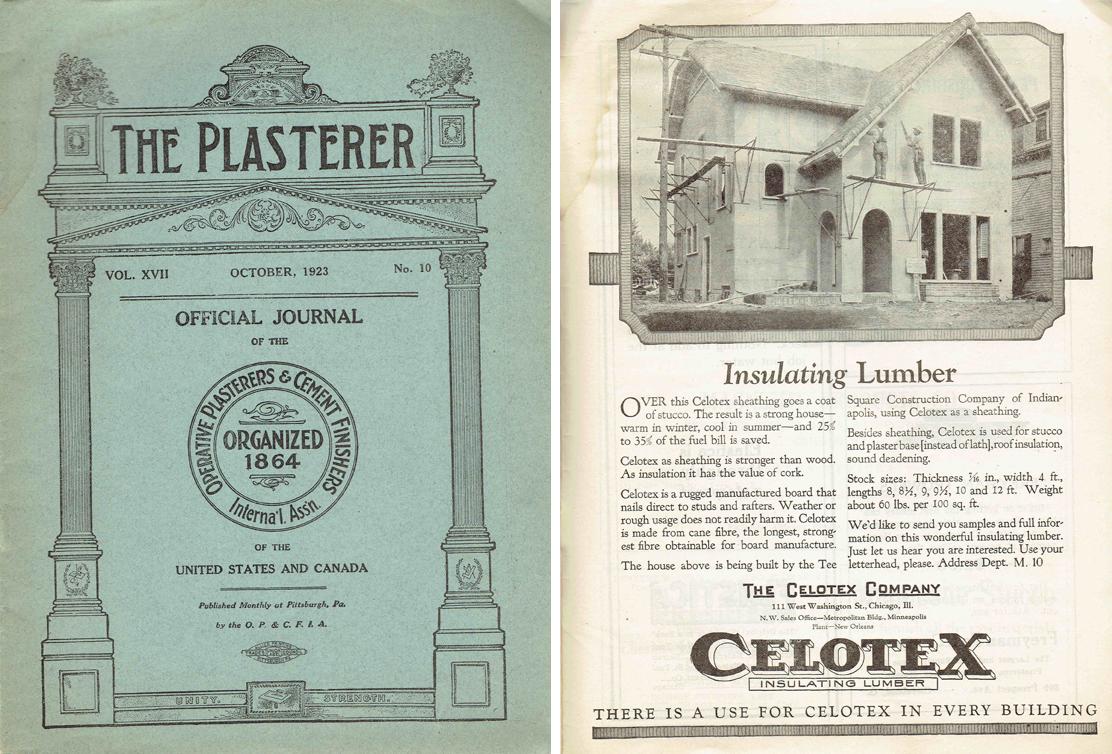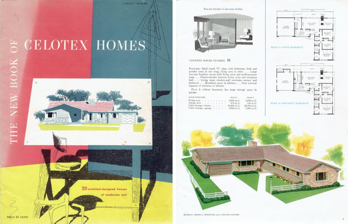 An extensive plan book featuring the use of Celotex roofing shingles, interior finishes, wall & ceiling insulation, and other building products in architect designed homes. Celotex products were implicated in litigation because of their asbestos content, and this booklet shows how extensively they were used in each house. (20465) $55.00