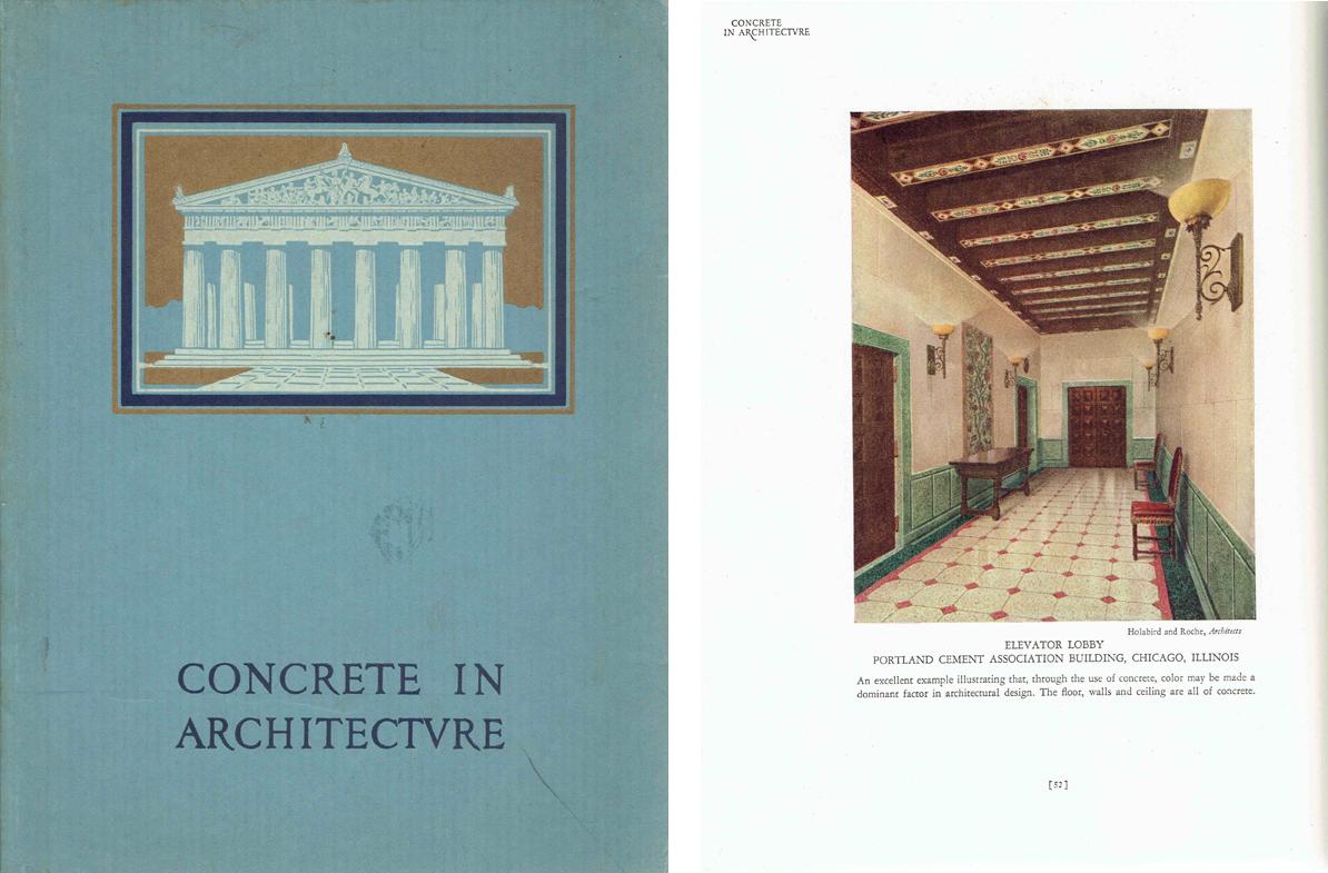 [Concrete & Cement]. Portland Cement Association. Concrete In Architecture (A portfolio of 6 architectural projects). Chicago, IL: Portland Cement Assoc., 1927. Original edition. Quarto, pp 59. 10 Color plates, b/w photographs on most pages. Authors: Marshall, Benjamin H.; Murphy, Frederick V.; Allison, David C.; Woollett, William Lee; Earley, John J.; Holabird, John A. Decorated Boards w/paper covers, aqua. Very Good Binding, Pages, Near Fine.