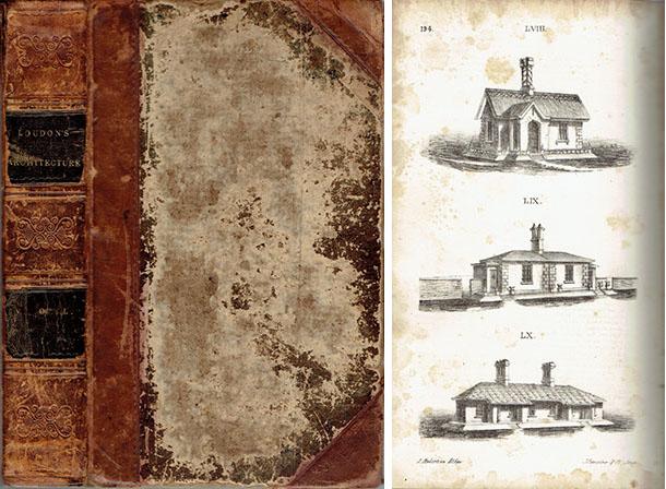 [Architectural History]. Loudon, John Claudius. Loudon's Encyclopedia of Cottage, Farm and Villa Architecture and Furniture containing numerous designs for dwellings, from the cottage to the villa, including farm houses, farmeries, and other agricultural buildings; several designs for country inns, public houses, and parochial schools; with the requisite fittings-up, fixtures, and furniture; and appropriate offices, gardens, and garden scenery; each design accompanied by analytical and critical remarks, illustrative of the principles of architectural science and taste on which it is composed. London: Longman, 1833. First edition. Small quarto, pp. xx, 560, illustrated with b/w drawings and engravings. Half-Leather. Very Good: heavy cover wear, 2" split to backstrip.