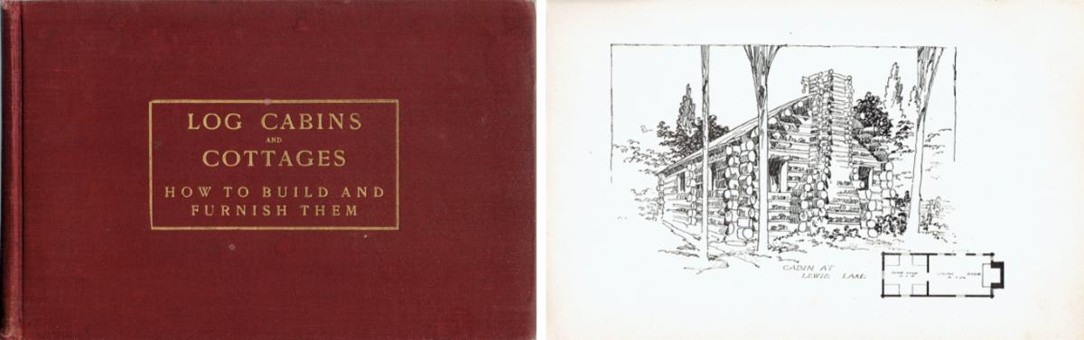 [Pattern Book]. Wicks, William S. Log Cabins and Cottages: How to Build and Furnish Them. New York: Forest and Stream Publishing Co., 1904. Fifth Edition. Oblong octavo, pp. 47 plus ca 60 pp perspective drawings of log cabins with floor plans and 57 illustrations within text. Original Cloth over Boards, burgundy w/gilt lettering. Very Good, hinges slightly loose.