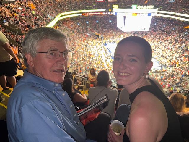 Our second photo features me with younger daughter Kim, at the Boston Garden. I have been a big fan of women in sports, and I have been intrigued by the impact on the WNBA by the arrival of Caitlin Clark. So, I got two (expensive!) tickets her team, the Indiana Fever, play a game at the Garden against the Hartford women's team. Turns out, it was perhaps the last game of the season for Caitlin, whose team won, but she pulled up lame in the fourth quarter. I sent this shot to my buddy Clem Labine, with the title "almost courtside." Clem wrote me back saying, "It's a great father-daughter shot, and you can almost see the court from there!"