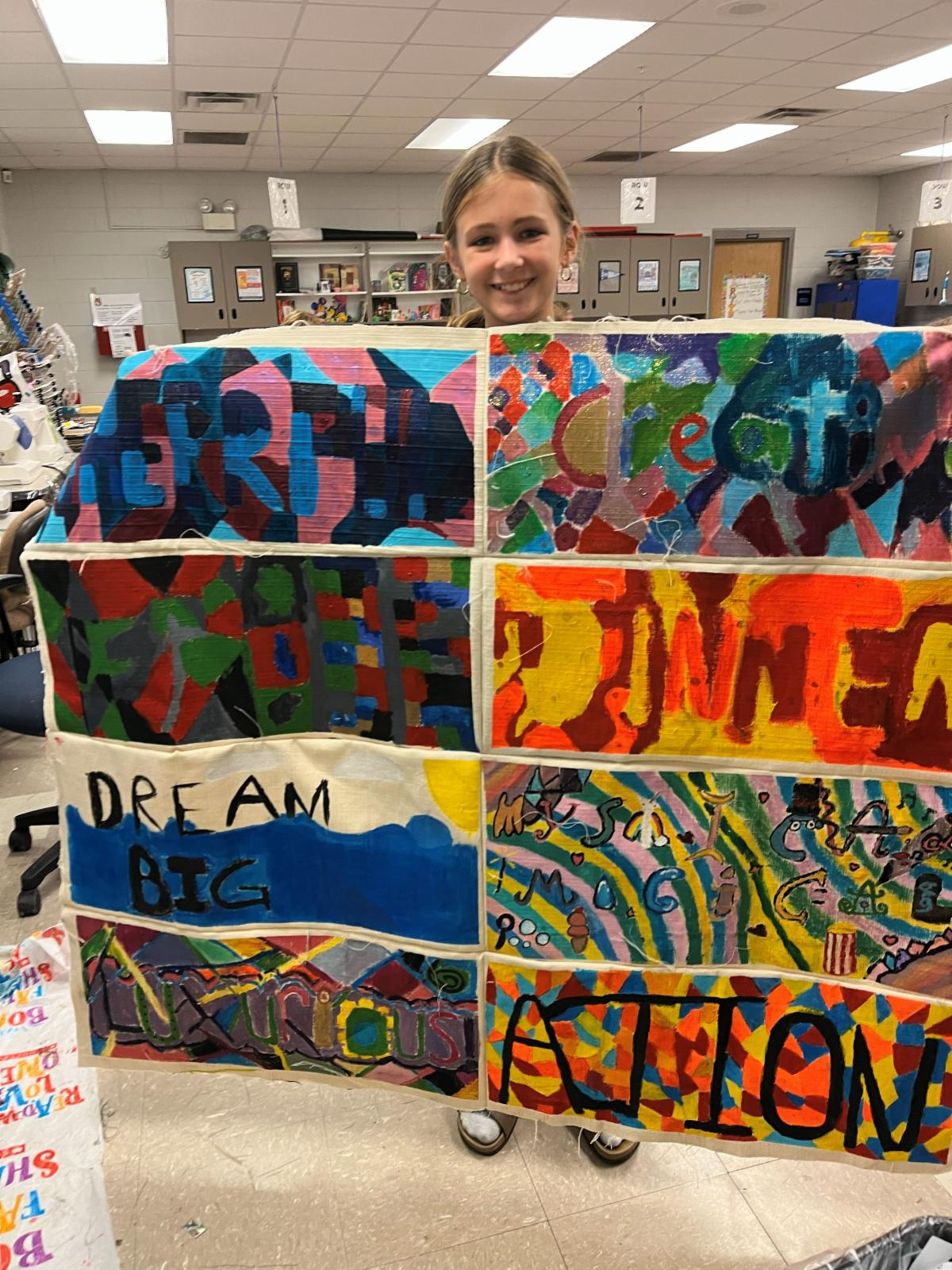 Jackson Heights Middle School recently unveiled a massive 36-foot quilt mural, a collaborative masterpiece created by Mrs. Elizabeth Rodney’s 2D Art program. Inspired by Rachel Gloria Adams and Ryan Adams’ mural, “The More I Wonder, The More I Love,” the project explored themes of open-mindedness and empathy. Utilizing fabric donated by Disney and acrylic paint from the Seminole Cultural Arts Council, students transformed traditional materials into fine art. This project was made possible by The SCPS Foundation through their "Grants for Great Ideas" program as well as the Oviedo community, who donated additional supplies.
