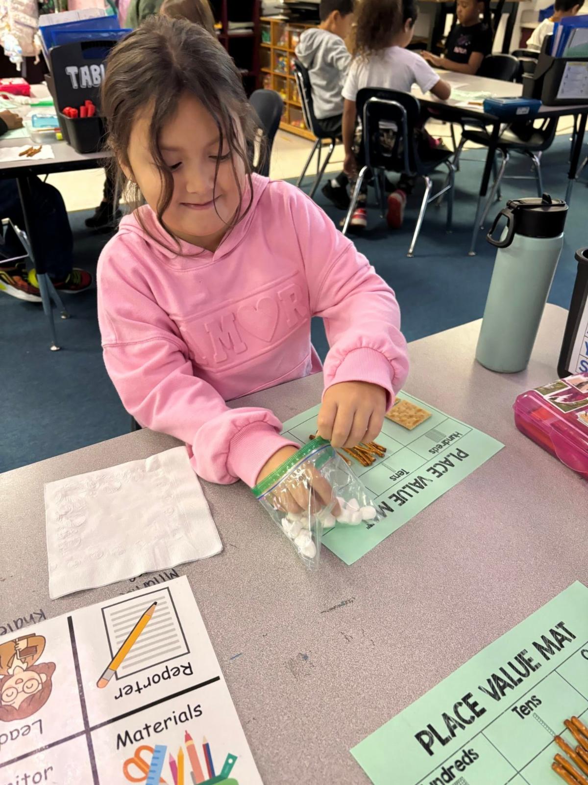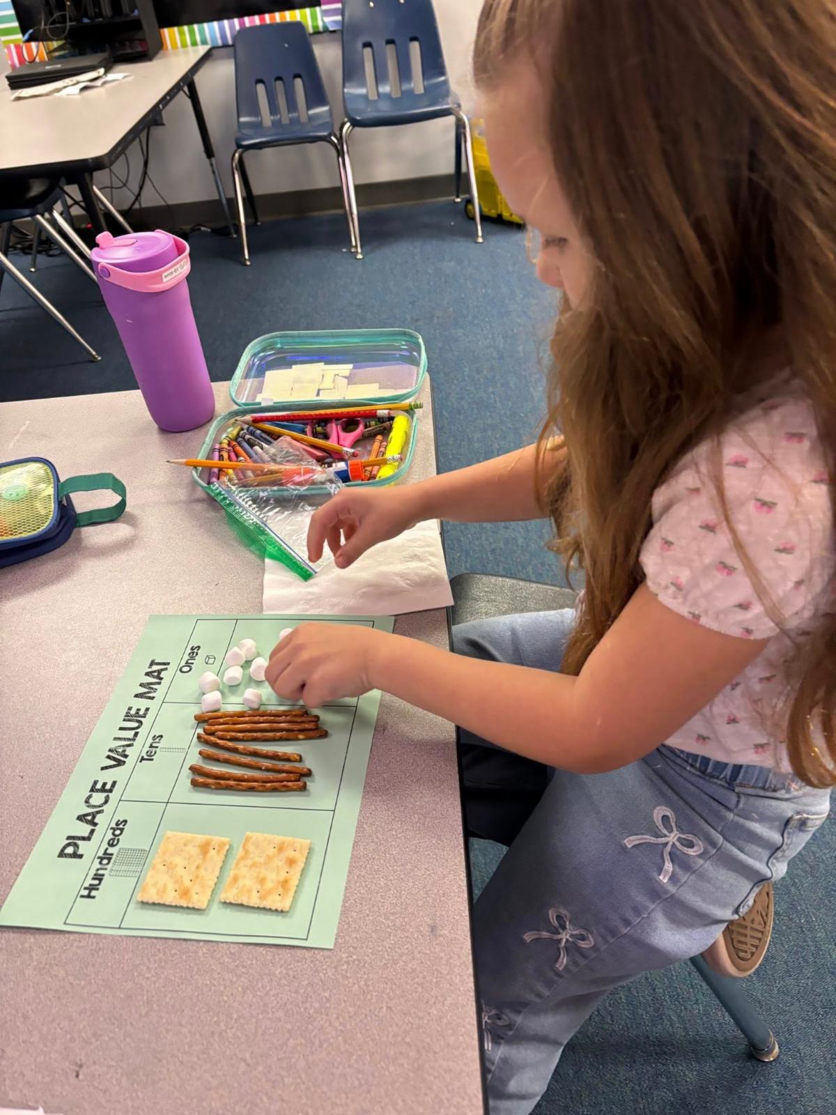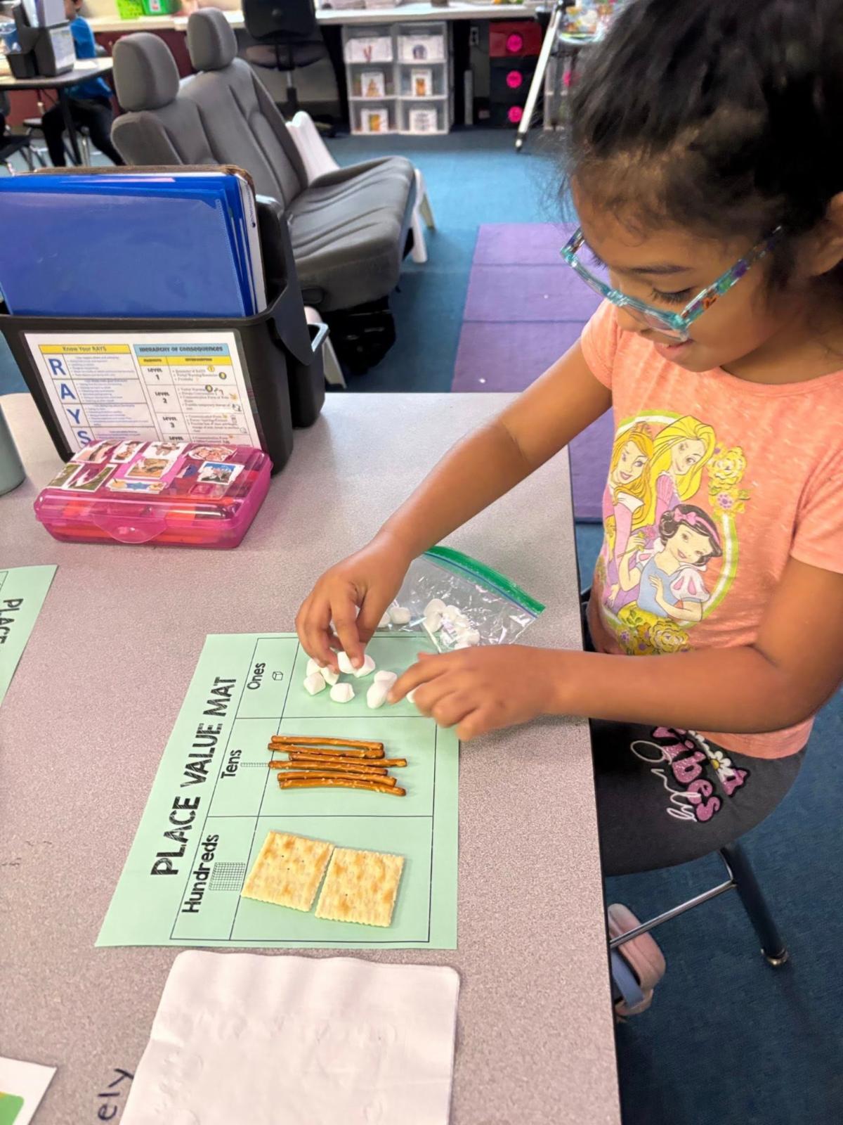 Mrs. Quagliani’s students at Evans Elementary, enjoyed a fun and interactive math lesson this week that they could eat when they were done. Using snacks to model each section of the place value chart, students practiced representing numbers in a hands-on way. Numbers were randomly called, and students showed the correct value on their mats. The activity kept all students engaged while encouraging excellent math discussion and teamwork. Tasty work, Sunrays!