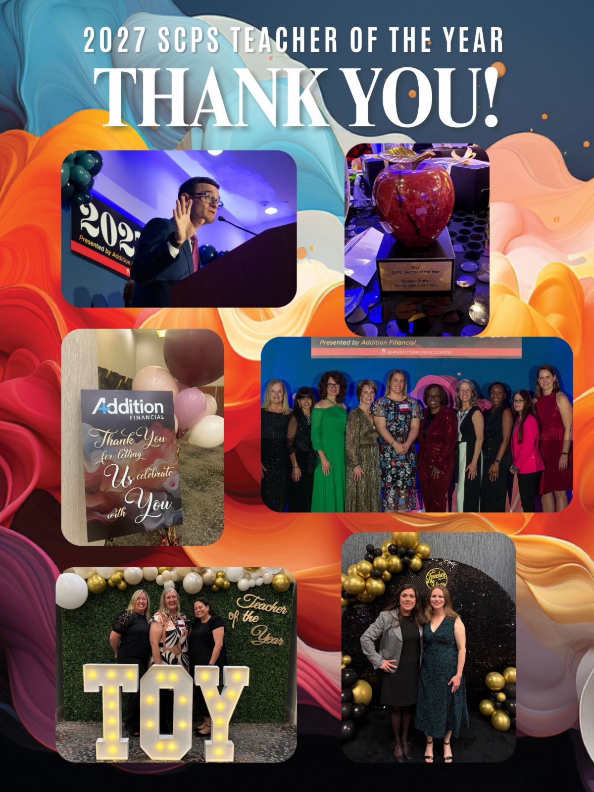“At Addition Financial, our roots in education run deep. It is a privilege to support education and educators for almost 90 years! Thank you for having us as the presenting sponsor of the Seminole County Public Schools Teacher of the Year ceremony to celebrate the dedication and passion that this year’s honorees bring to their classrooms, schools, and communities daily. Congratulations to Christie Rey, from Geneva Elementary School, for being recognized as the 2027 SCPS Teacher of the Year!”