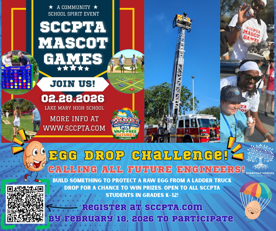 All Seminole County families are invited to join SCCPTA for their Mascot Games, a fun, free community event bringing families, schools, and mascots together for an afternoon of excitement and connection. The event will take place on Saturday, February 28, from 12:00 - 3:00 pm.