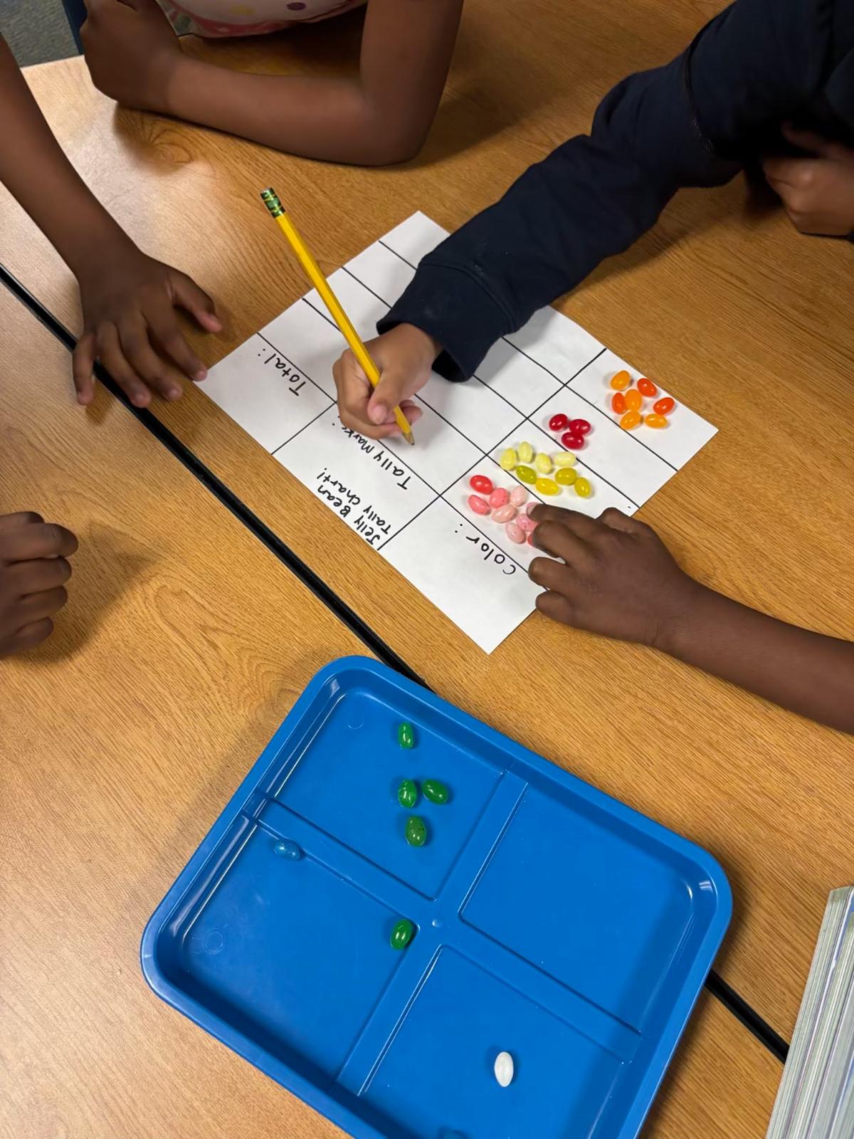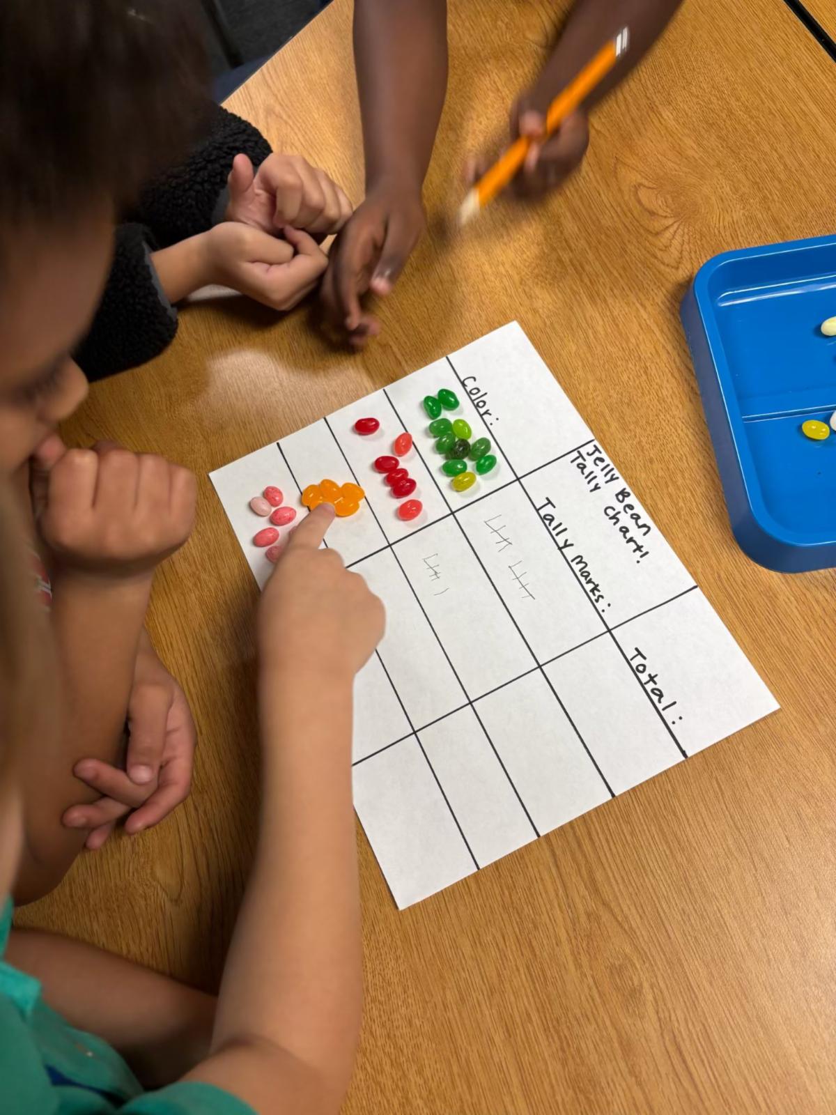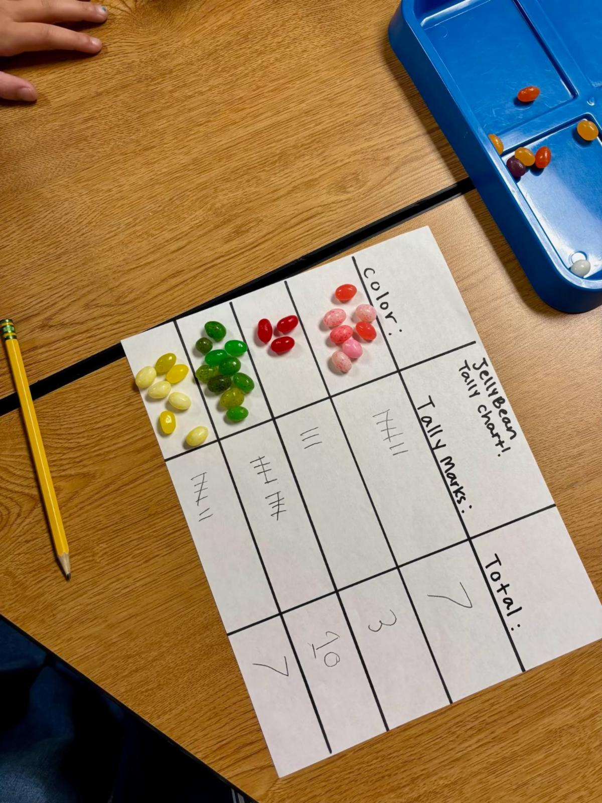 To bring math to life, students participated in a colorful, hands-on jellybean activity where they practiced sorting, counting, and recording their data. Working together, they discovered which colors appeared most and least.