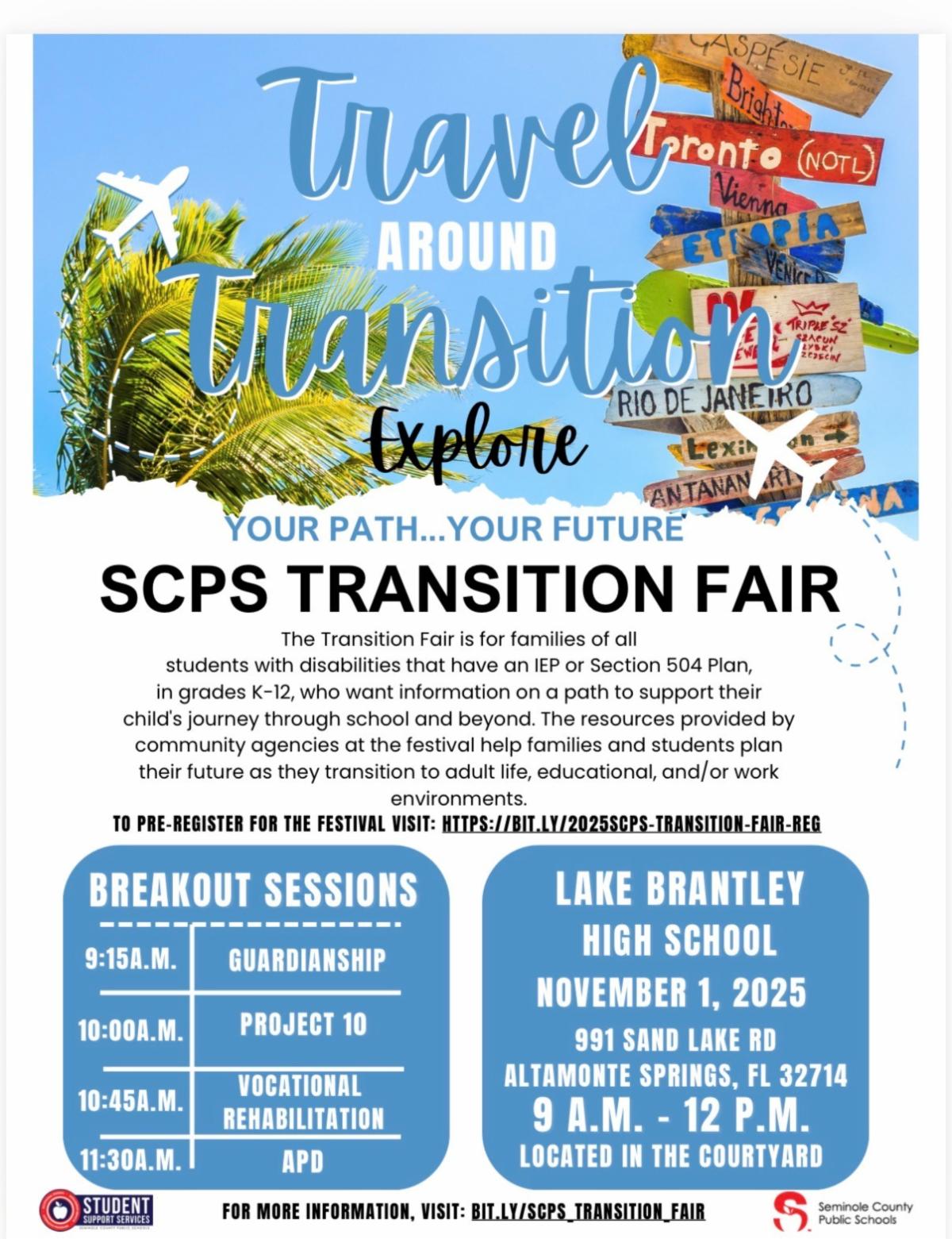 SCPS invites you to the 2025 Transition fair! This event is for families of all students with disabilities who have an Individualized Education Plan (IEP) or Section 504 Plan, in grades K-12, who want information on a path to support their child's journey through school and beyond. The resources provided by community agencies at the Transition Fair help families and students plan their future as they transition to adult life, educational, and/or work environments. The event will take place November 1, 2025, from 9am to 1pm at Lake Brantley High School. If you would like to pre-register for this event, please complete the google form. For more