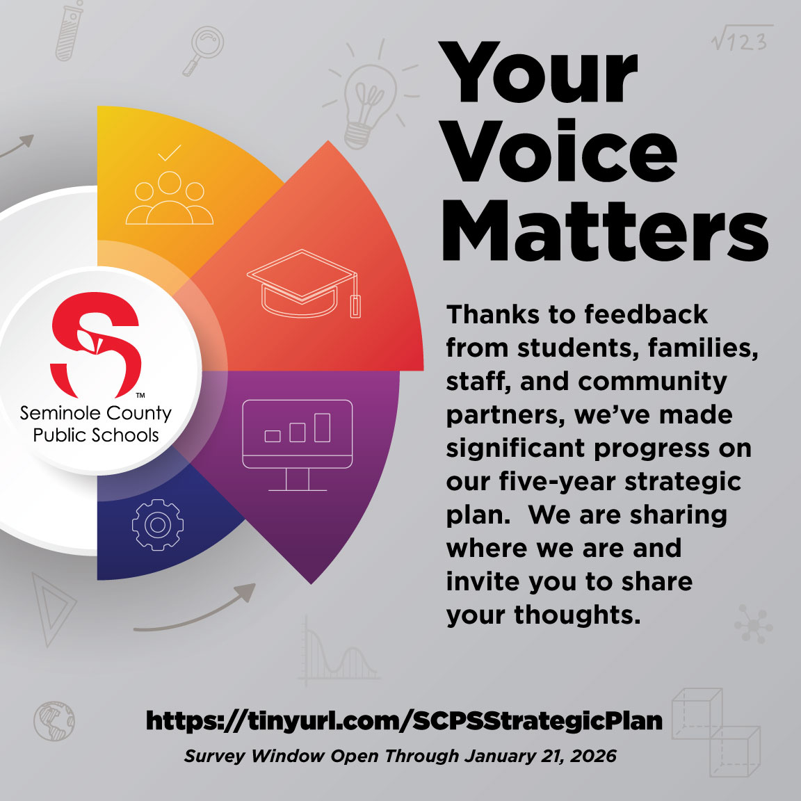 We’ve made meaningful progress on our five-year strategic plan, and now we want to share where we are and hear from you. Please take a few minutes to complete our short survey at https://tinyurl.com/SCPSStrategicPlan and help shape what’s next for SCPS. The survey is open through January 21, 2026.
