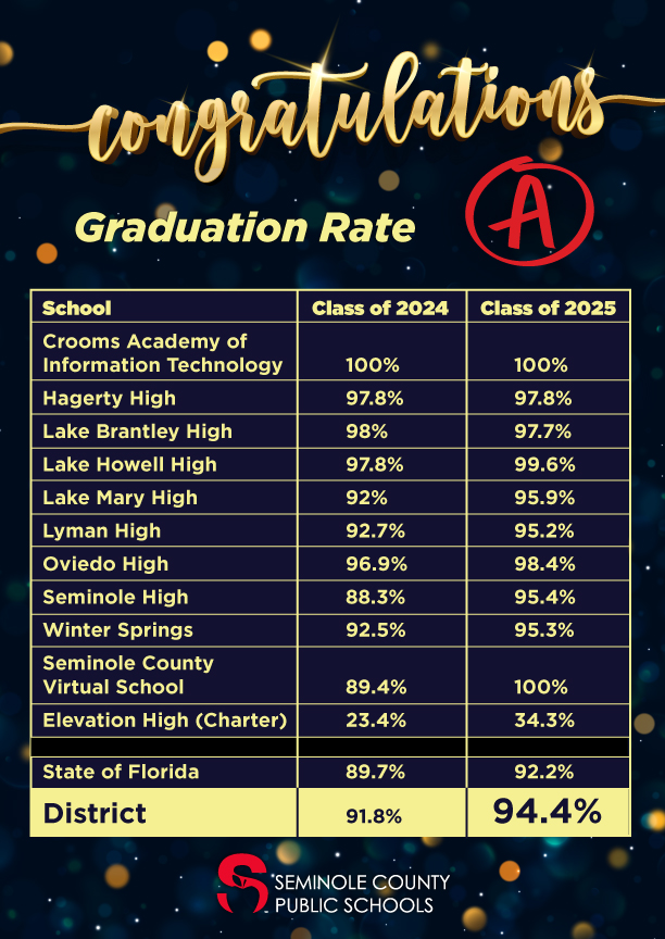 Seminole County Public Schools (SCPS) is proud to announce a graduation rate of 94.4% for the 2024-2025 school year, representing an increase of 2.6% over last year, and SCPS continues to outpace the state average of 92.2%. This result reflects the collective efforts of students, educators, staff, and families who remain committed to academic success across the district.