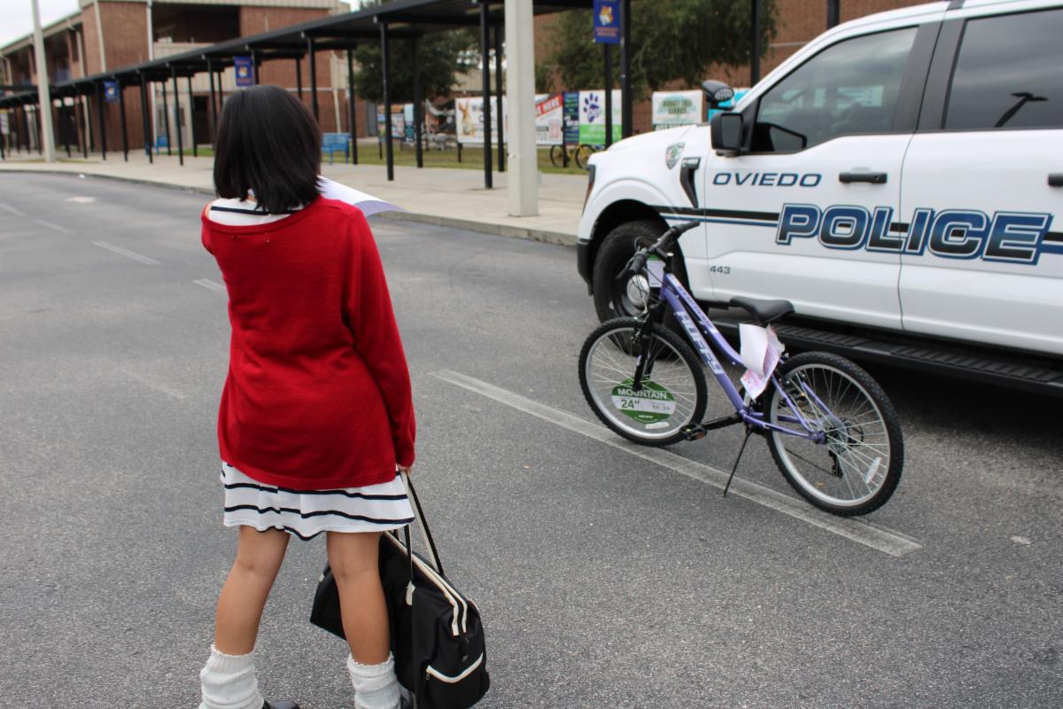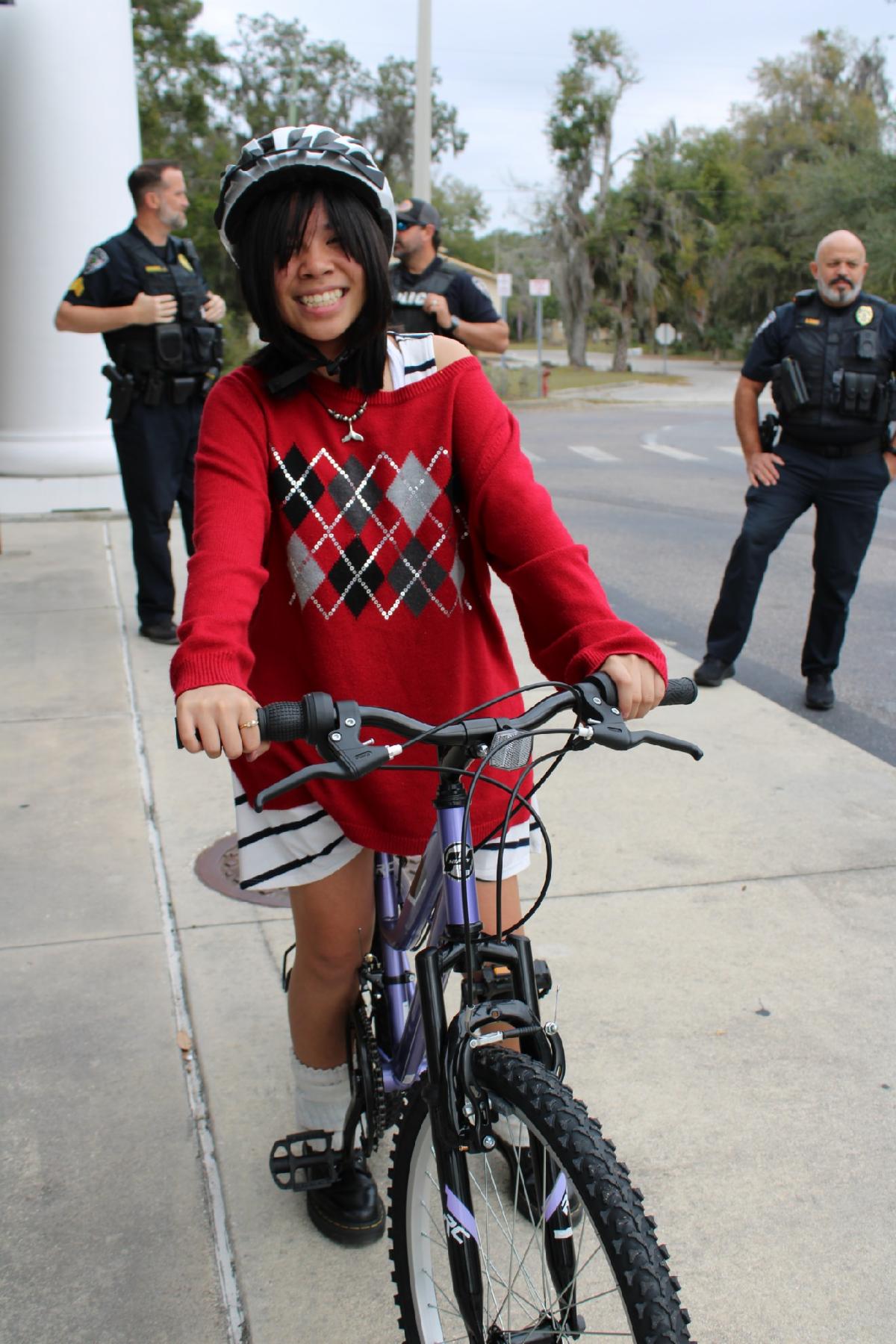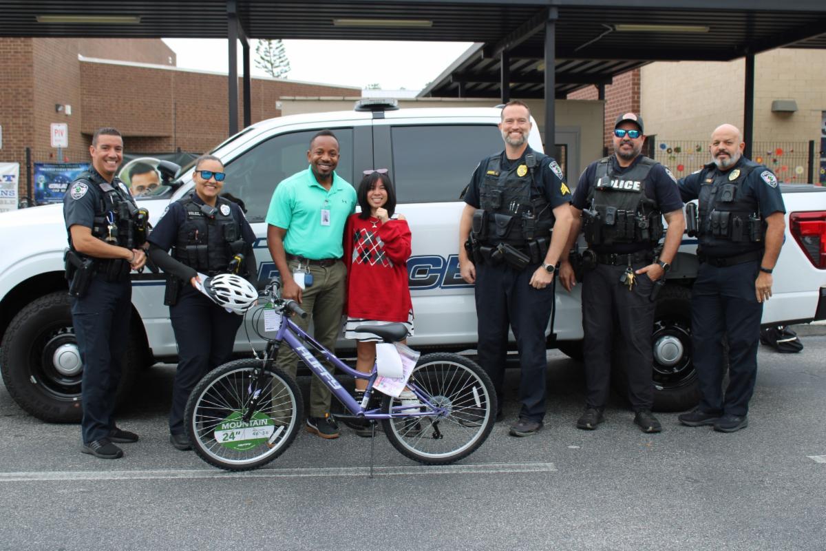 Officer Lopez and Officer Velez, from the Oviedo Police Department, worked together with The Christmas Bike Program to donate a bicycle, helmet, and lock to a student who had been walking to school each day while her friends rode their bikes. The officers wanted to help her travel safely and enjoy riding alongside her peers.