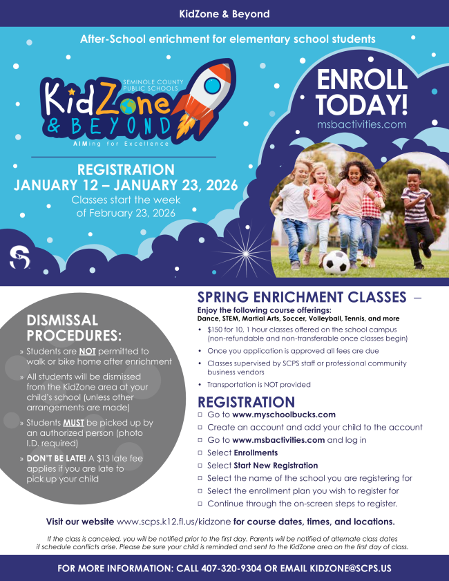 Spring Enrichment is a 10-week, after-school, extracurricular program for all SCPS students in grades K-5. With the support of several elementary campuses and our KidZone & Beyond partners, we will be offering 1-hour weekly courses in dance, STEM, basketball, soccer, and more. SCPS students may attend classes at any school where classes are offered. Registration for enrichment ends Friday, January 23, 2026.