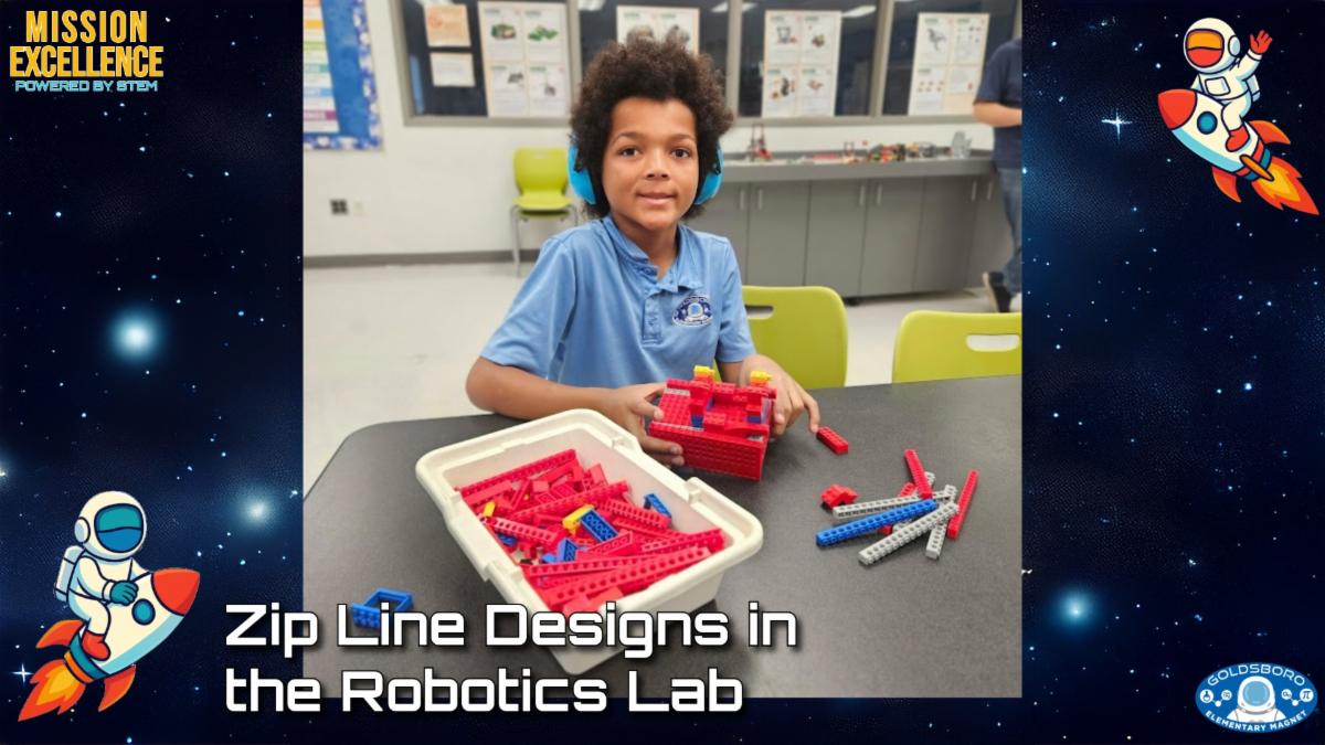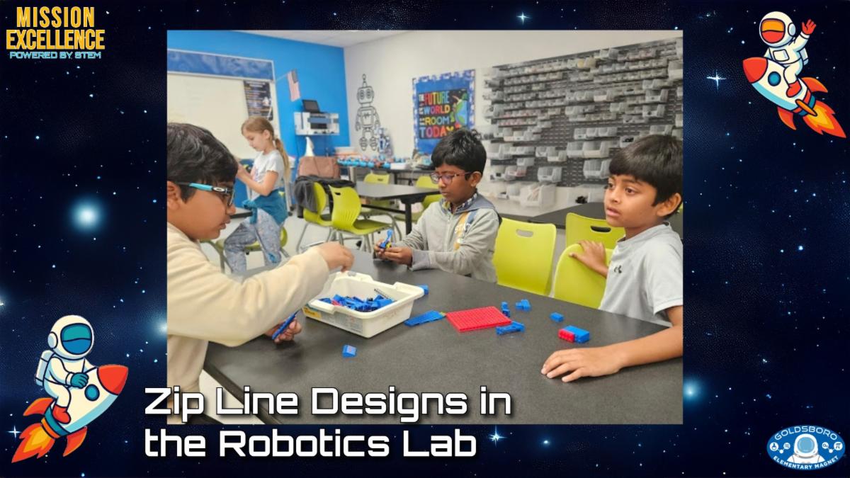 Goldsboro Elementary students are exploring the engineering design process in the Robotics and Computer Science lab. Using Legos, they are designing and building structures that can safely descend a zip line, combining creativity, problem-solving, and hands-on learning.