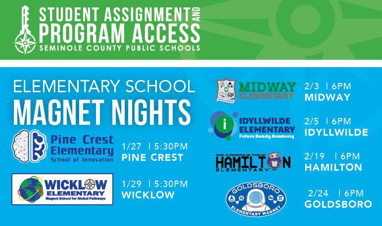 | | The on-time VPK application period for the 2026-2027 School Year at SCPS locations is January 10 to February 10. To be eligible for VPK, a child must be four years of age by September 1, 2026. SCPS VPK offers a high-quality program designed to prepare students to enter Kindergarten ready to learn! Full-day and half-day programs are available. For more information, visit the SCPS VPK website. | | Elementary Magnet School Application Period NOW OPEN | | It's enrollment time for our unique elementary magnet schools. Families interested in an elementary magnet school for the 2026-2027 School Year are encouraged to attend the upcoming Magnet Nights to interact with school teams, and learn more about program offerings. The on-time application period for Elementary School Magnet Programs for the 2026-2027 school year is open from January 1 through March 1. Learn more | | Goldsboro Elementary School | | Hamilton Elementary School | | Idyllwilde Elementary School | | | | Pine Crest Elementary School | | Wicklow Elementary School | |
