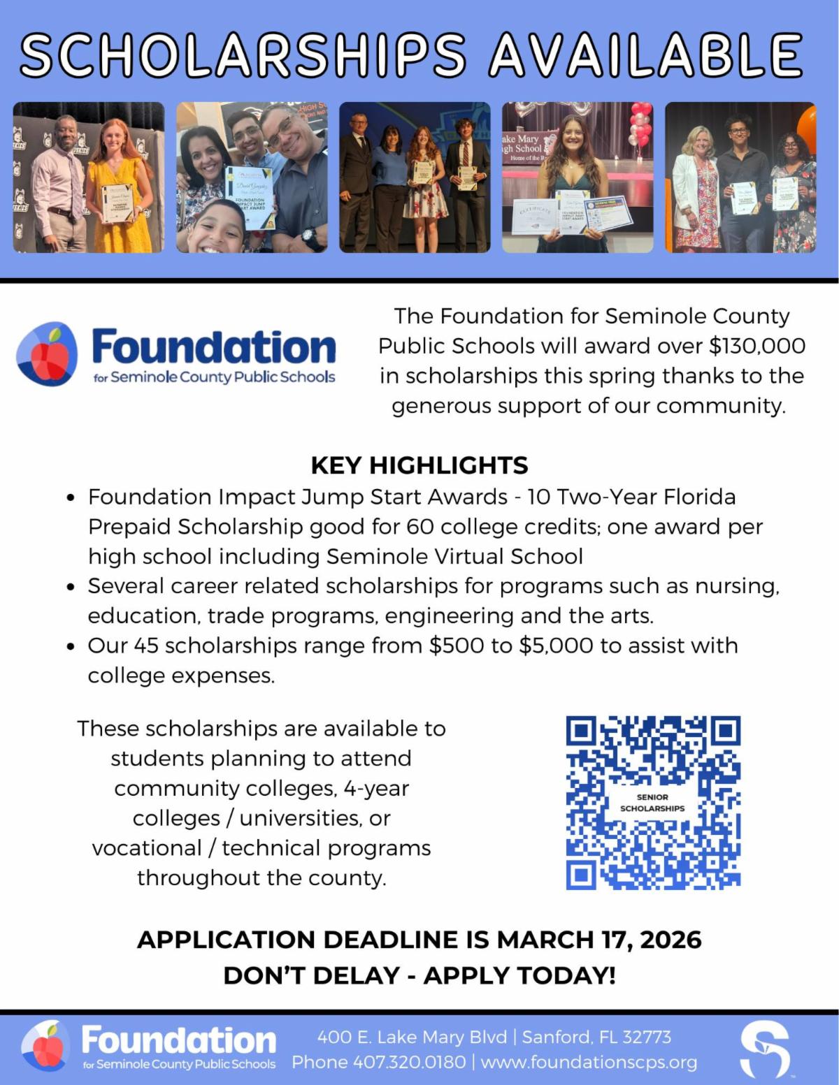 The Foundation's Senior Scholarship application is now live! It will award over 45+ scholarships to the Seminole County Public Schools Class of 2026 this spring, with recipients from all 10 high schools! Foundation scholarships range in value, and while most are available to all SCPS High Schools, some are specific to Hagerty, Lake Brantley, Lyman, and Seminole. Some opportunities focus on Areas of Study such as Trade Programs, Education, Nursing, the Arts, Engineering, and STEM fields, or to students who’ve participated in athletic programs, arts programs, extracurricular activities, and community service. Other factors are considered, such as students who have overcome challenges, experienced homelessness, or demonstrated financial need.