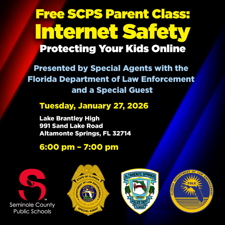 Join Special Agents from the Florida Department of Law Enforcement for a FREE SCPS Parent Class on Internet Safety. Discover practical information and tools for protecting your kids online. There will be an opportunity for Q & A and a special guest in attendance. Special thanks to our partners Altamonte Springs Police Department for bringing this opportunity to life! | |