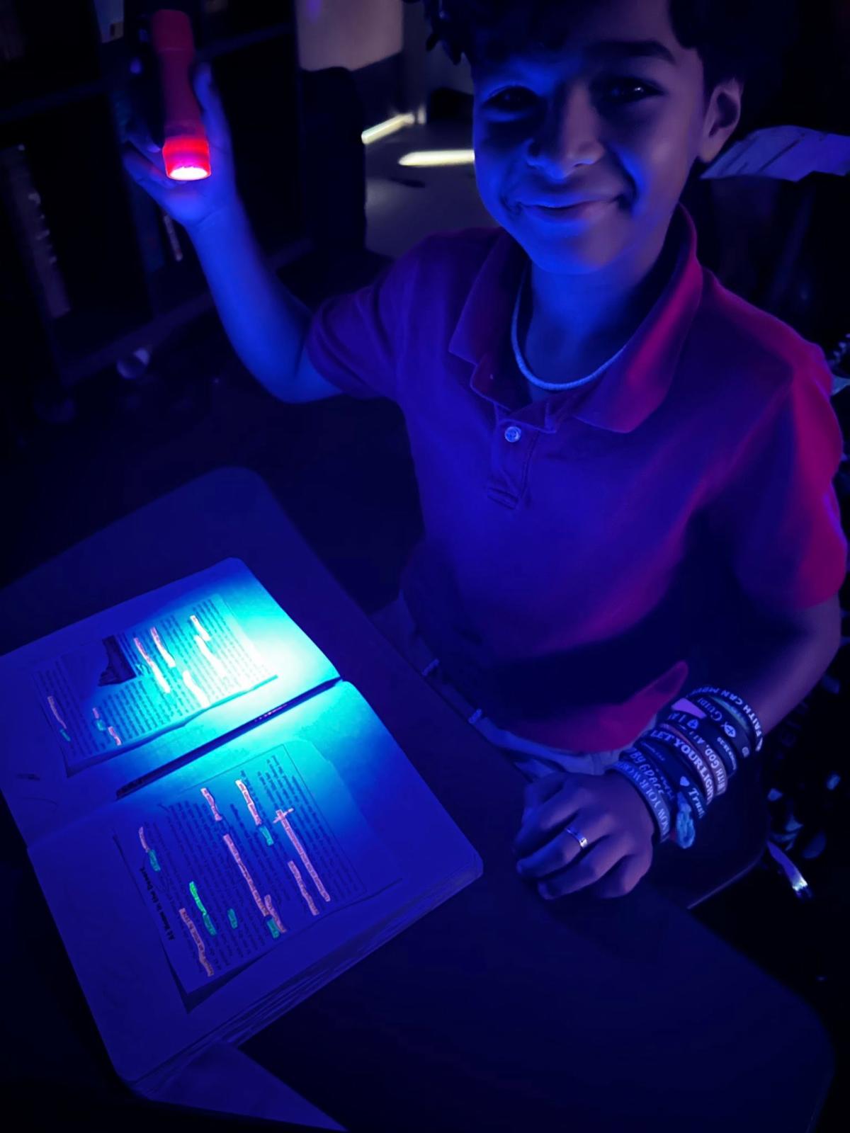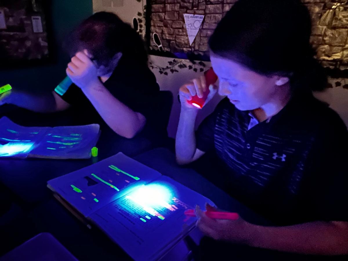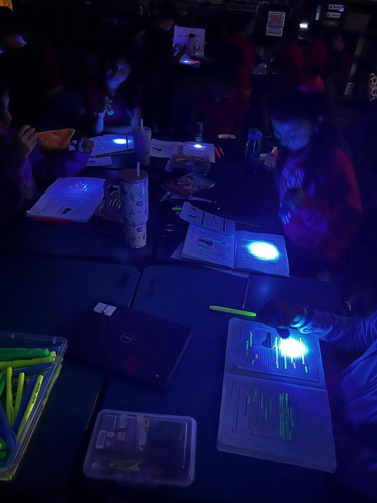 Fifth-grade students recently lit up their learning during a vibrant, neon-themed reading lesson focused on identifying central ideas.