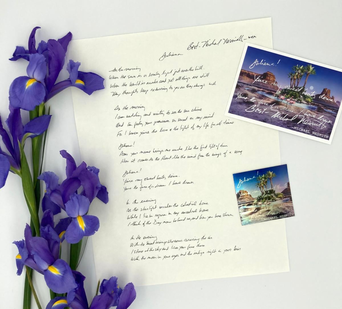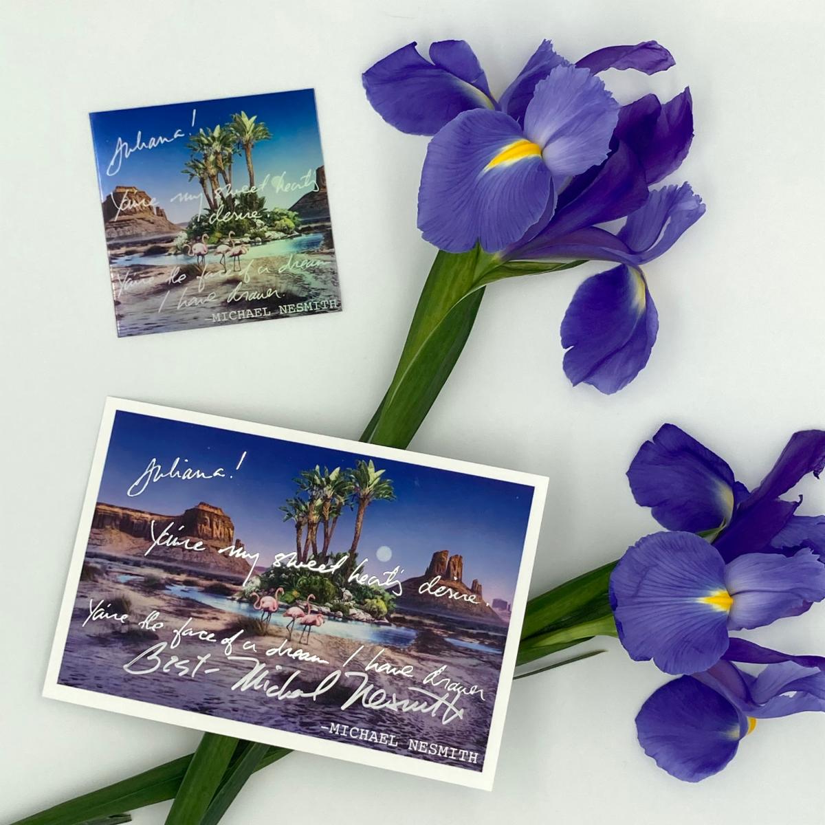 Need a card for your Valentine? Through the end of February, all orders of $50 or more will include a Juliana Valentine postcard signed by Michael Nesmith!* We left plenty of room for your personal message on the back.