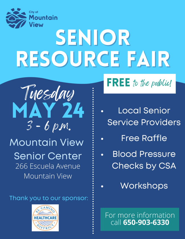 Join us at the Senior Center on Tuesday, May 24 from 3 – 6 p.m. for the Senior Resource Fair. The Senior Resource Fair provides the community with available resources. For more information visit MountainView.gov/seniorresourcefair.