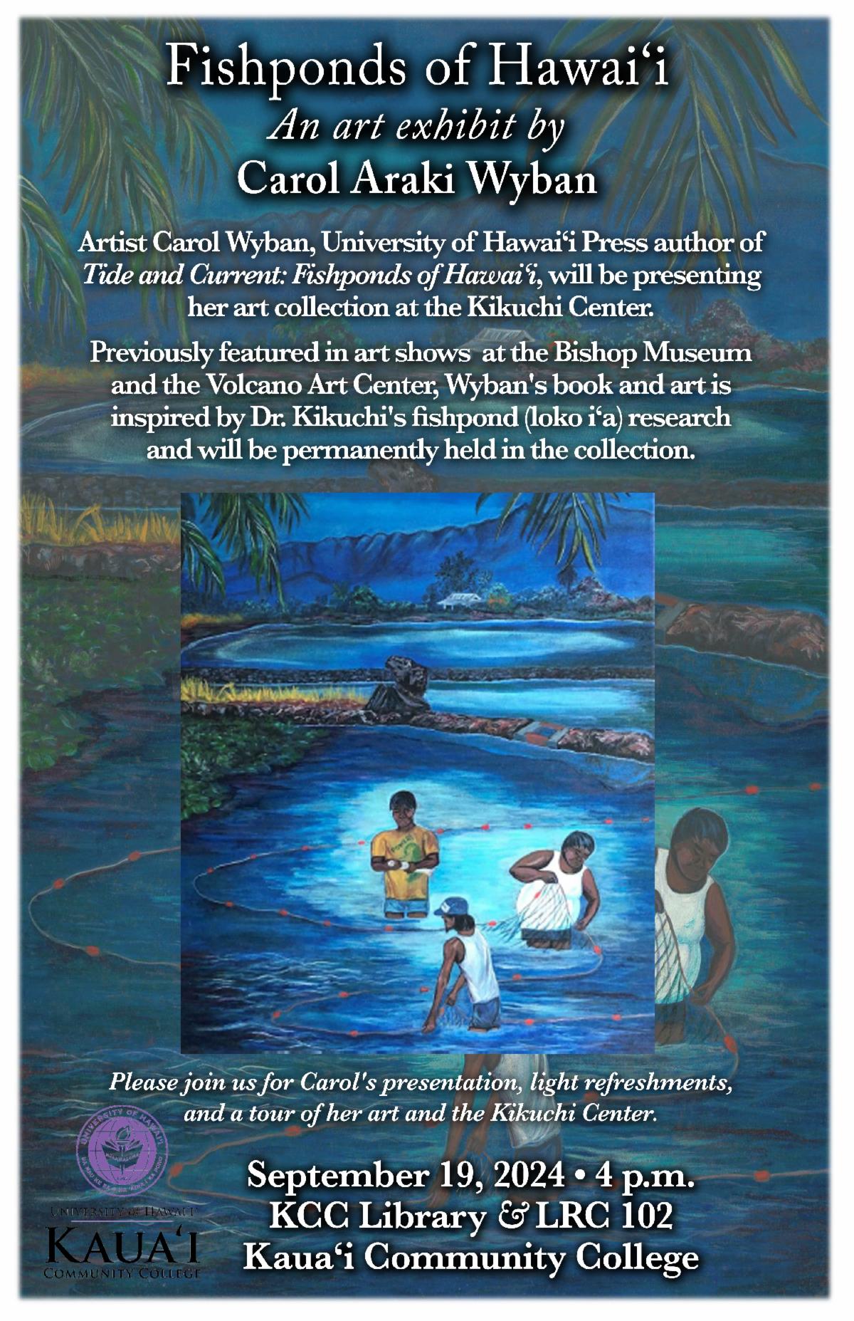 Join us as artist Carol Wyban presents her art work that is being permanently housed in the Kikuchi Center. Her art features Native Hawaiian fishpond and mythological themes, and was inspired by Dr. Kikuchi's research. Pupus and refreshments will be available in the library, LRC 102 starting at 4 p.m.