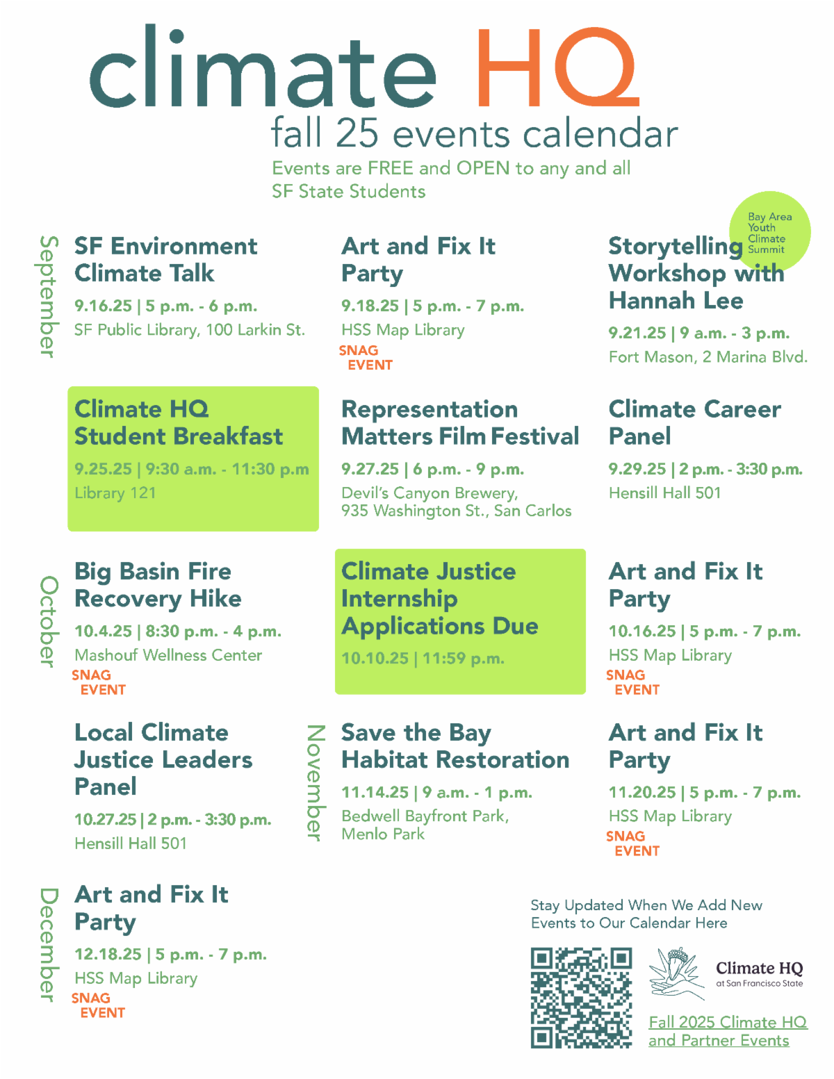 Climate HQ Events Calendar | | Get involved this fall with Climate HQ’s calendar of events! Build community at Art and Fix It Parties, explore big ideas through panels and career connections, and take action with hands-on habitat restoration projects. Celebrate diverse voices at the Representation Matters Film Fest and learn storytelling strategies with journalist and SFSU alum Hannah Lee! Partner events with SNAG, SFE, and Save the Bay add even more ways to connect, learn, and make an impact throughout the semester. | | | | |