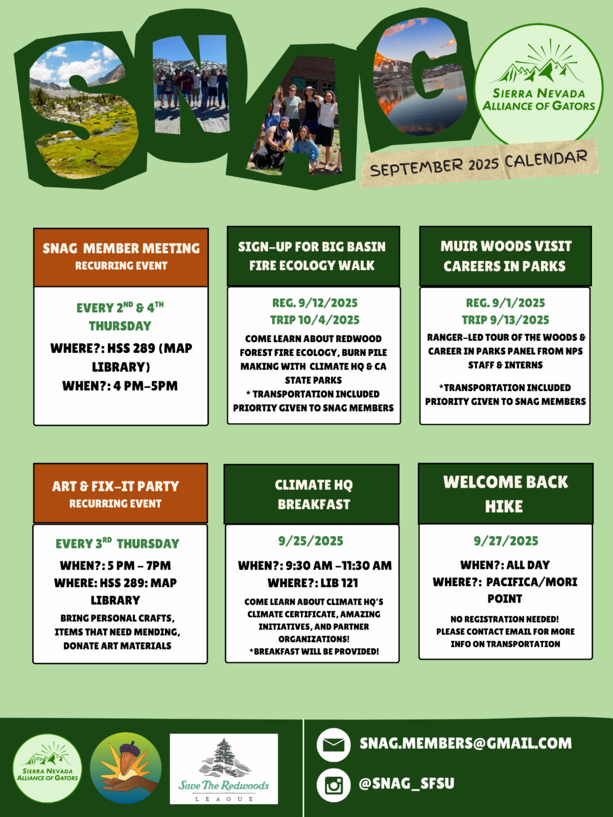 The Sierra Nevada Alliance of Gators has an incredible calendar of events lined up. Their work builds powerful connections between students, the Sierra Nevada Field Campus, and the broader climate movement. Follow SNAG on Instagram or email snag.members@gmail.com to join.
