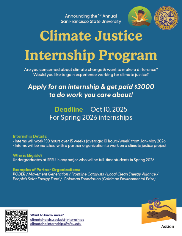 Welcome back to campus for fall 2025! When times are difficult, we know collective action is the antidote. We hope that as Climate HQ—the hub for education, research, and action on climate justice across the entire SF State campus—we are one place you can turn to. We have so many exciting events, opportunities, internships, classes, trips, and more to invite you to this year, join us!
