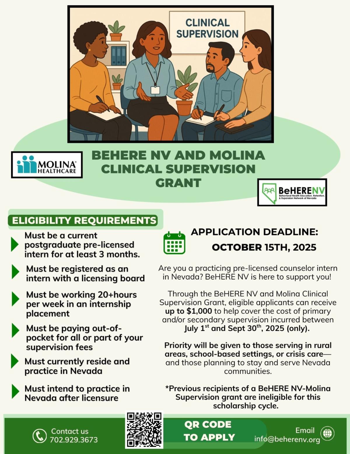 BeHERE NV, in partnership with Molina Healthcare, is offering financial support to pre-licensed postgraduate counseling interns across Nevada through this Clinical Supervision Grant. This opportunity provides up to $1,000 in reimbursement for intern supervision costs incurred between July 1 and September 30, 2025.