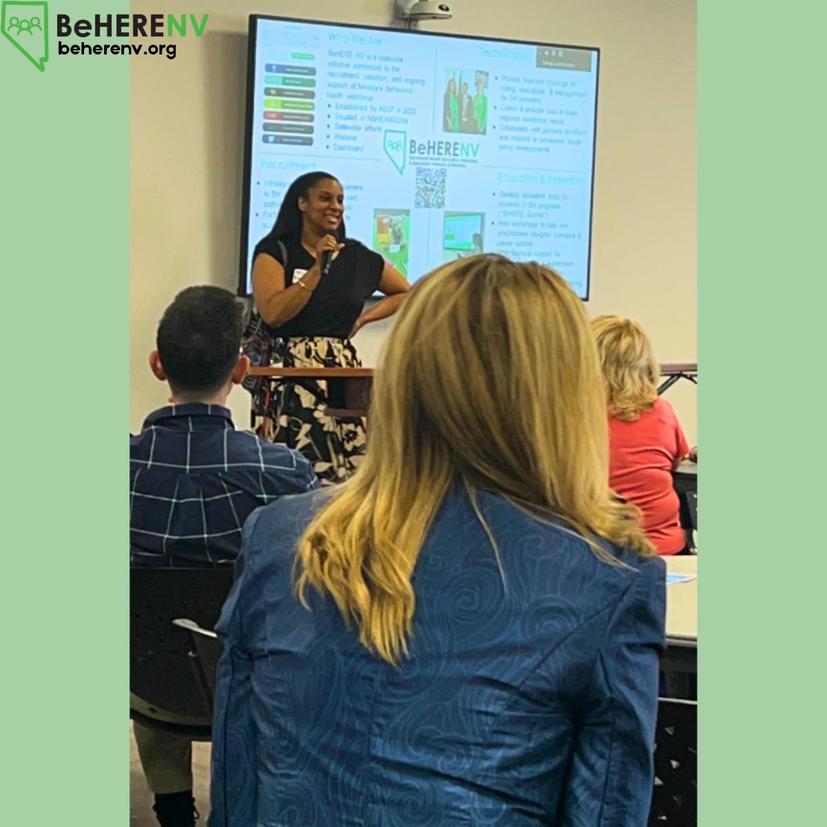 | | BeHere NV acknowledges both National Suicide Prevention Month as well as National Recover Month. Be sure to utilize SAMSHA Tool Kit for resources. | | BeHERE NV Associate Director of Technical Assistance and Policy, Dr. Ashley Noel Pruitt, presenting Behavioral Health Policy work to new students as part of a public policy panel at the UNLV Greenspun School of Urban Affairs, with Dr. Margoth Tello-Rodriguez and Dr. Michael Bernardo. | Dr. Ashley Noel Pruitt presenting BeHERE NV to the L.I.M.A. (Law Enforcement Intervention for Mental Health & Addiction) Community Resource Sharing Meeting at the UNR extension North Las Vegas campus. | | Stay up-to-date on our latest news by subscribing to our newsletter! Please share it with your network. We'll be posting monthly progress updates and more about BeHERE NV. You can also find past editions in the BeHERE NV newsletter section of our website. | | | | Funding for BeHERE NV was made possible by Assembly Bill 37 (2023, 82nd Nevada Legislative Session) and the Nevada System of Higher Education | | | | |